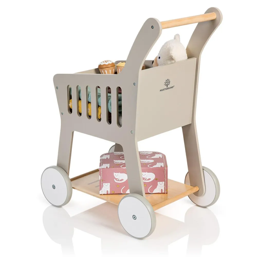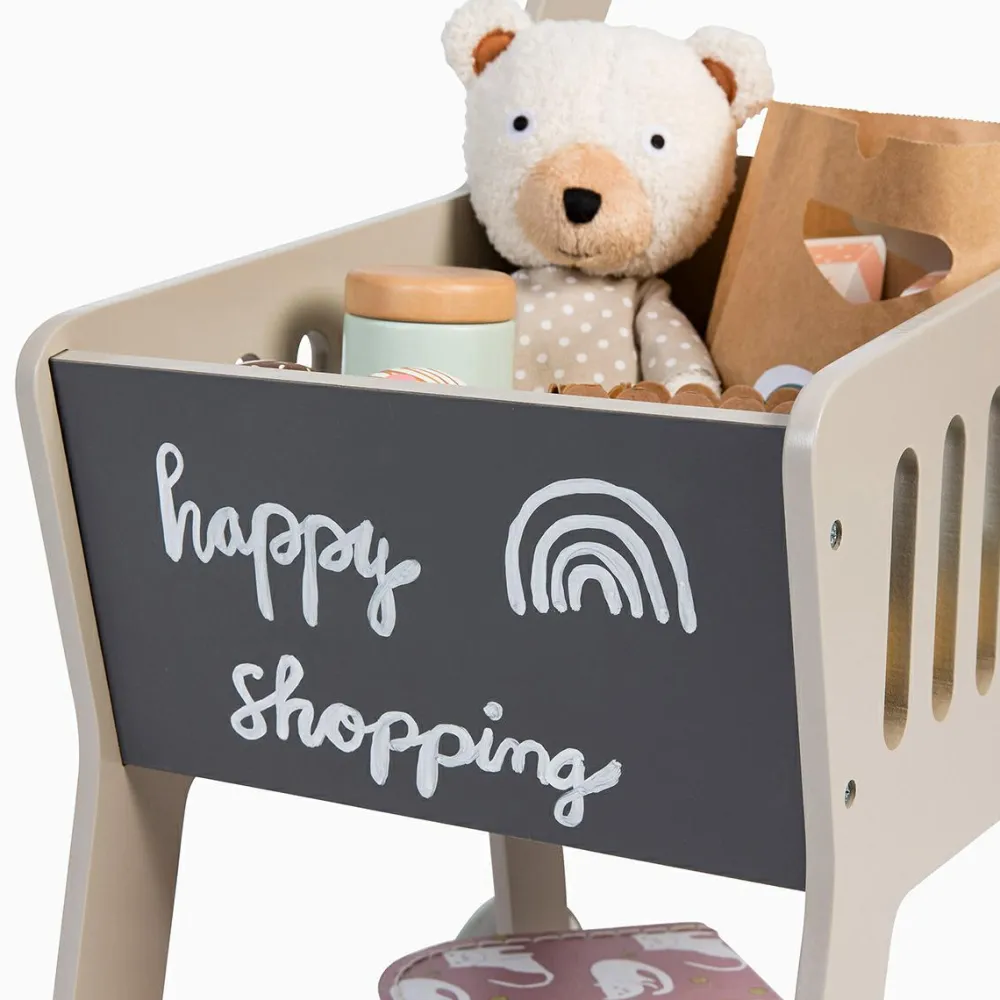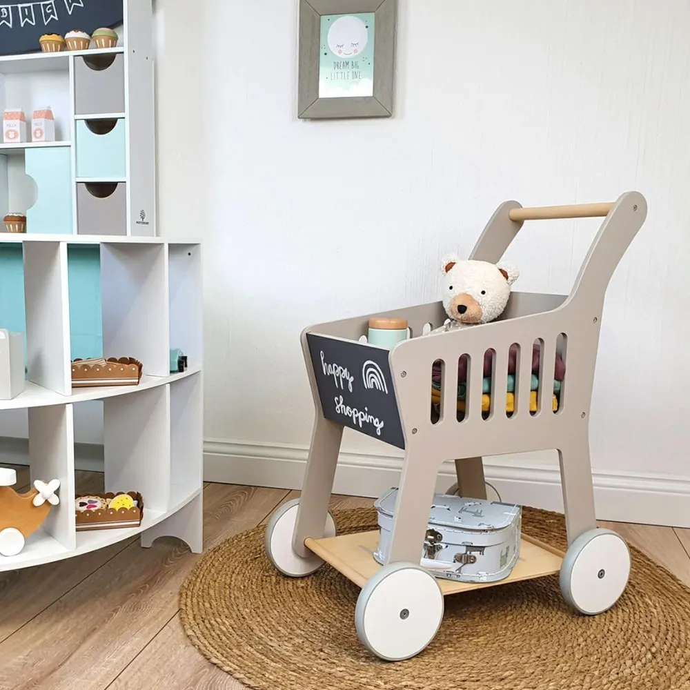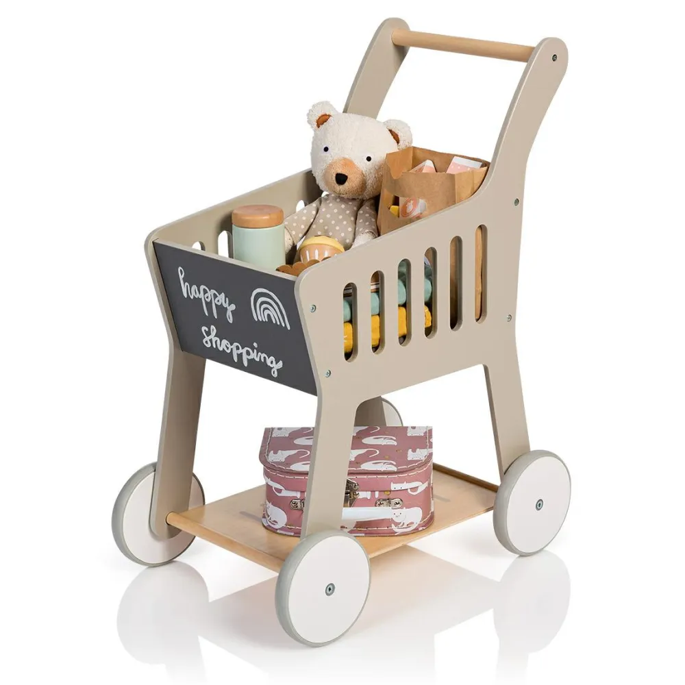 Indkøbsvogn med gummihjul så dit barn kan ræse rundt og læsse vognen uden at larme ret meget med vognen.