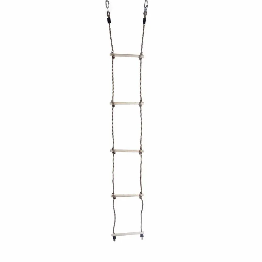 Den er af træ med PE-reb af plast, og i toppen er der metalringe.