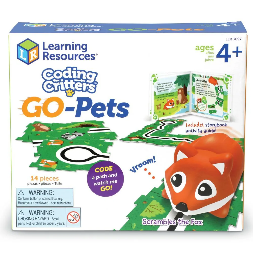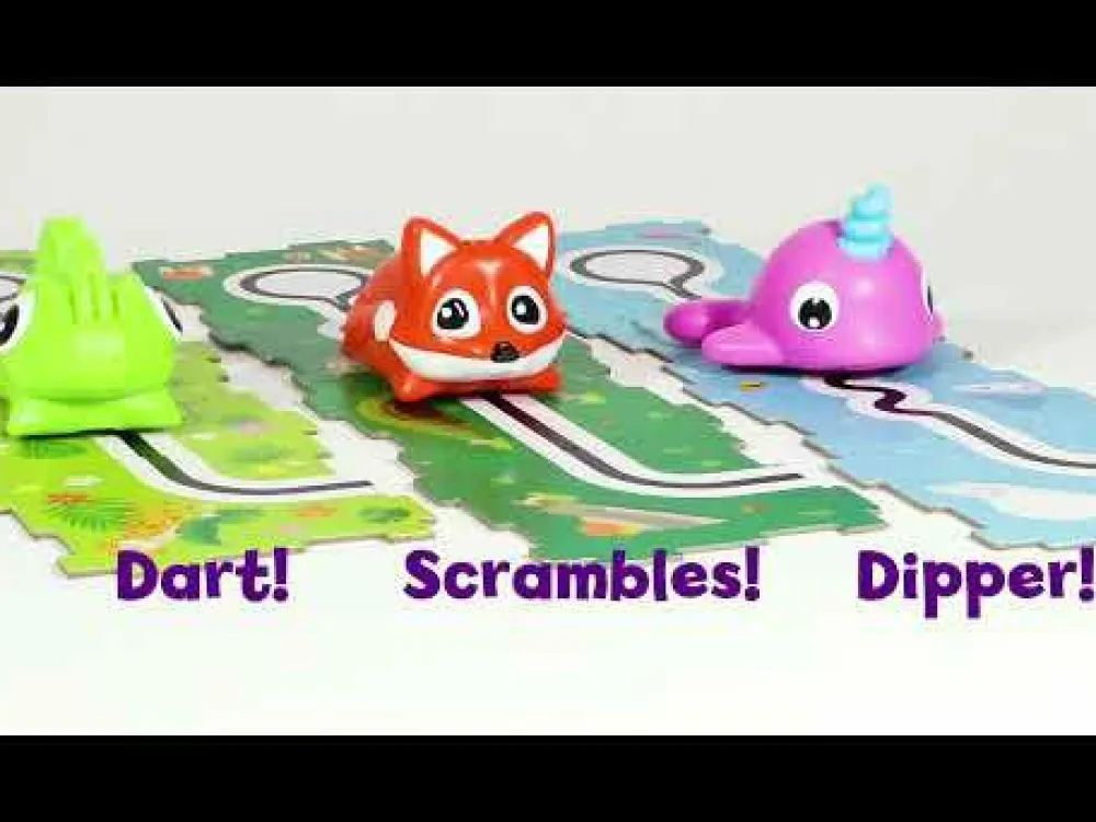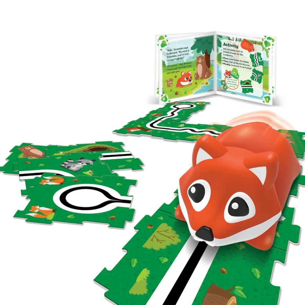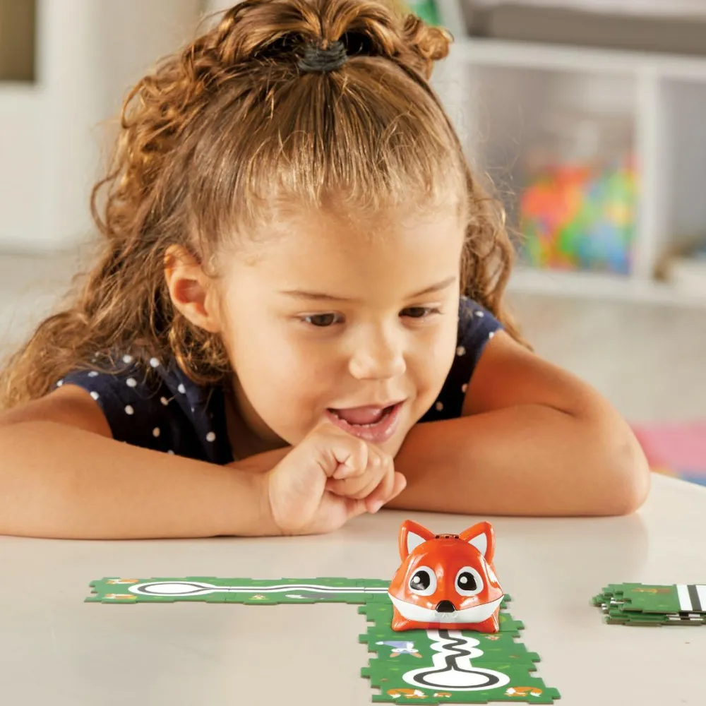 Denne lille dyreven kan følge en sort streg, når du har tændt på “on” knappen. Dit barn kan dermed lægge vejbanerne, så den sorte streg er fortløbende og ubrudt, og så vil ræven følge stregen. Logikken i at bygge en bane med højre- venstre- og ligeud er dermed den samme, som når man koder med blokke på en computer eller en tablet.
