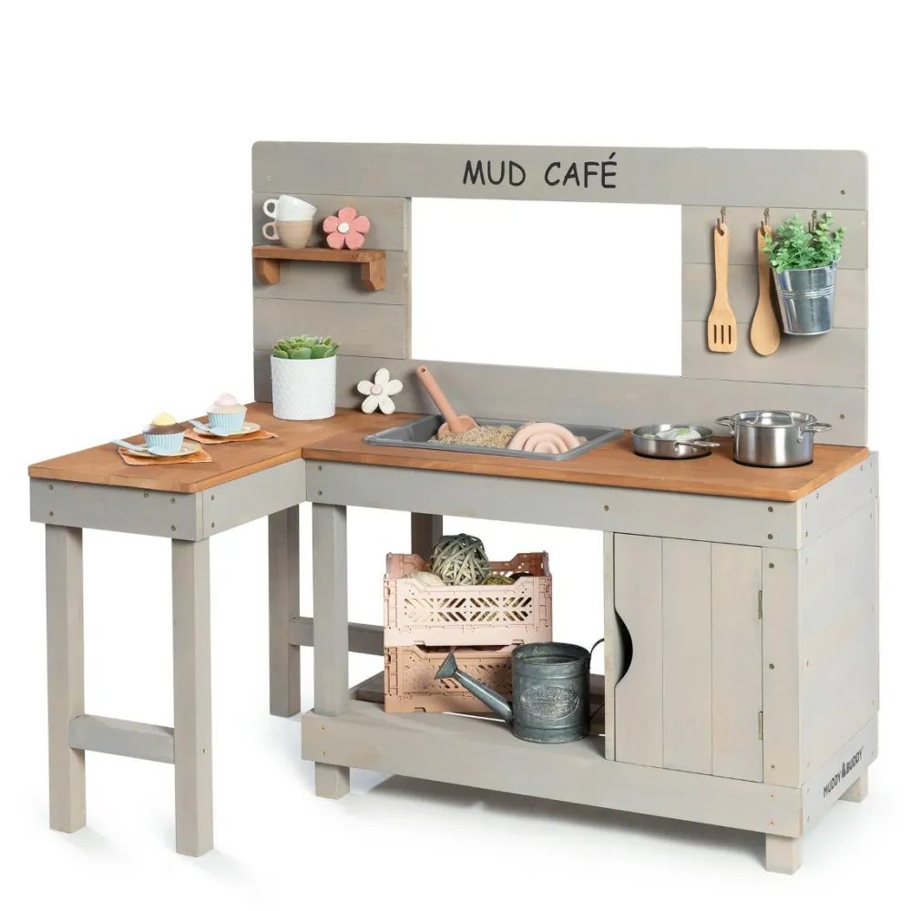 MUDDY BUDDY® udendørs legeudstyr er fremstillet af massivt cyprestræ, som har fået træbehandling. Vi anbefaler, at træet genbehandles årligt med vandbaseret træbeskyttelse, at skruerne efterses årligt, og at møblerne fra MUDDY BUDDY® opbevares tørt og indendørs om vinteren for at holde længst muligt. Der kan forekomme knaster, farveskift eller ujævnheder i det massive træ, for sådan er træ nu engang. Det tager mellem 30 minutter og 1 time at samle legetøjet, og du får brug for en skruetrækker.