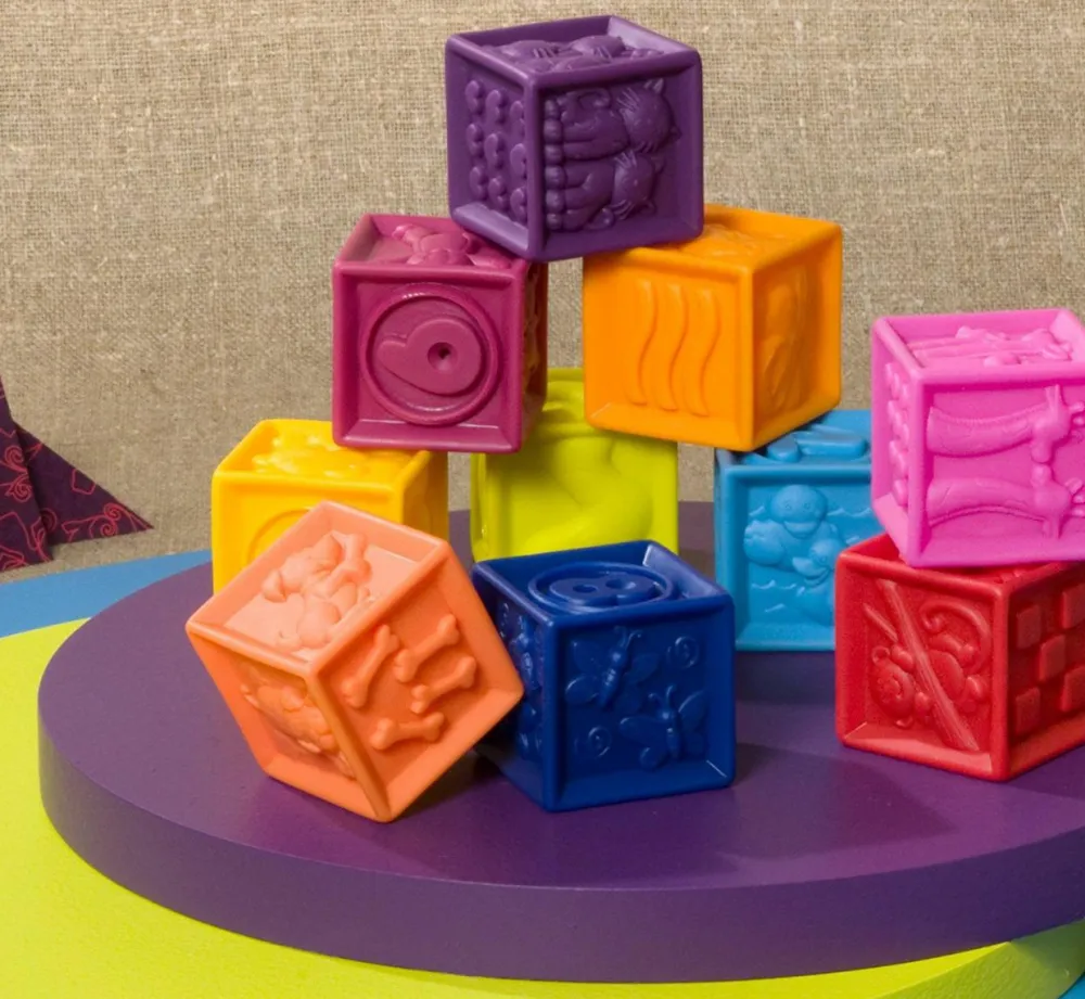 Klodserne med de fine relieffer på alle sider – dvs. 60 motiver i alt, skal nok vække dit barns nysgerrighed. De kan nemlig både stables, tygges på, klemmes og udfordre taktilsansen. Kort sagt – de kan være med allevegne og bruges til mange lege.