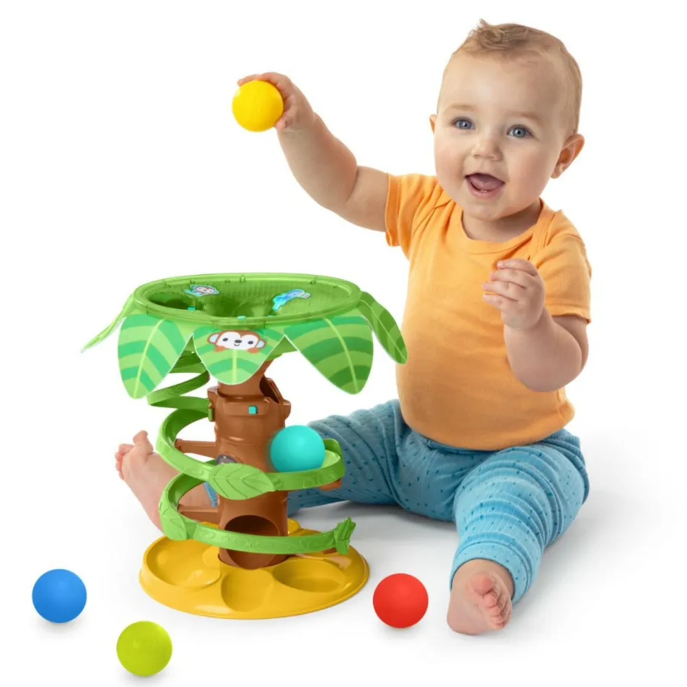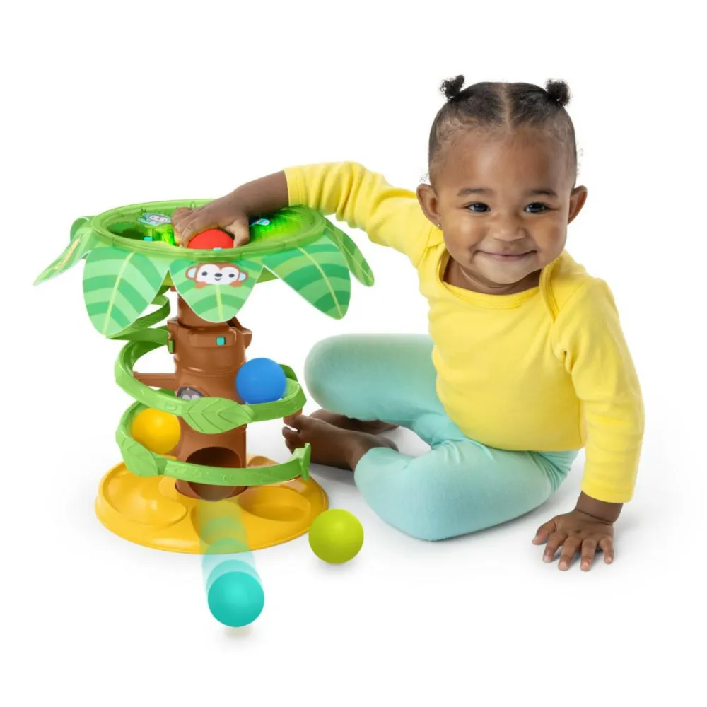 Når kuglerne triller rundt i kuglebanen siger den sjove junglelyde og kan spille flere forskellige melodier. Den laver også lyde, hvis dit barn trykker på abe- og papegøjeklapperne.