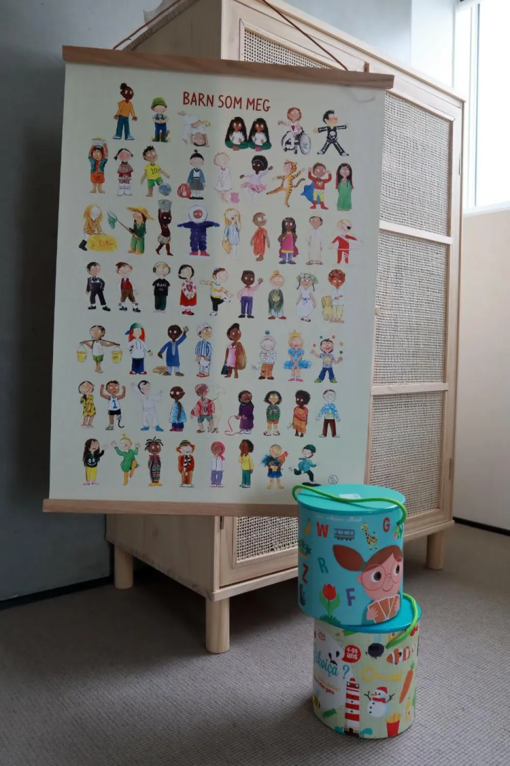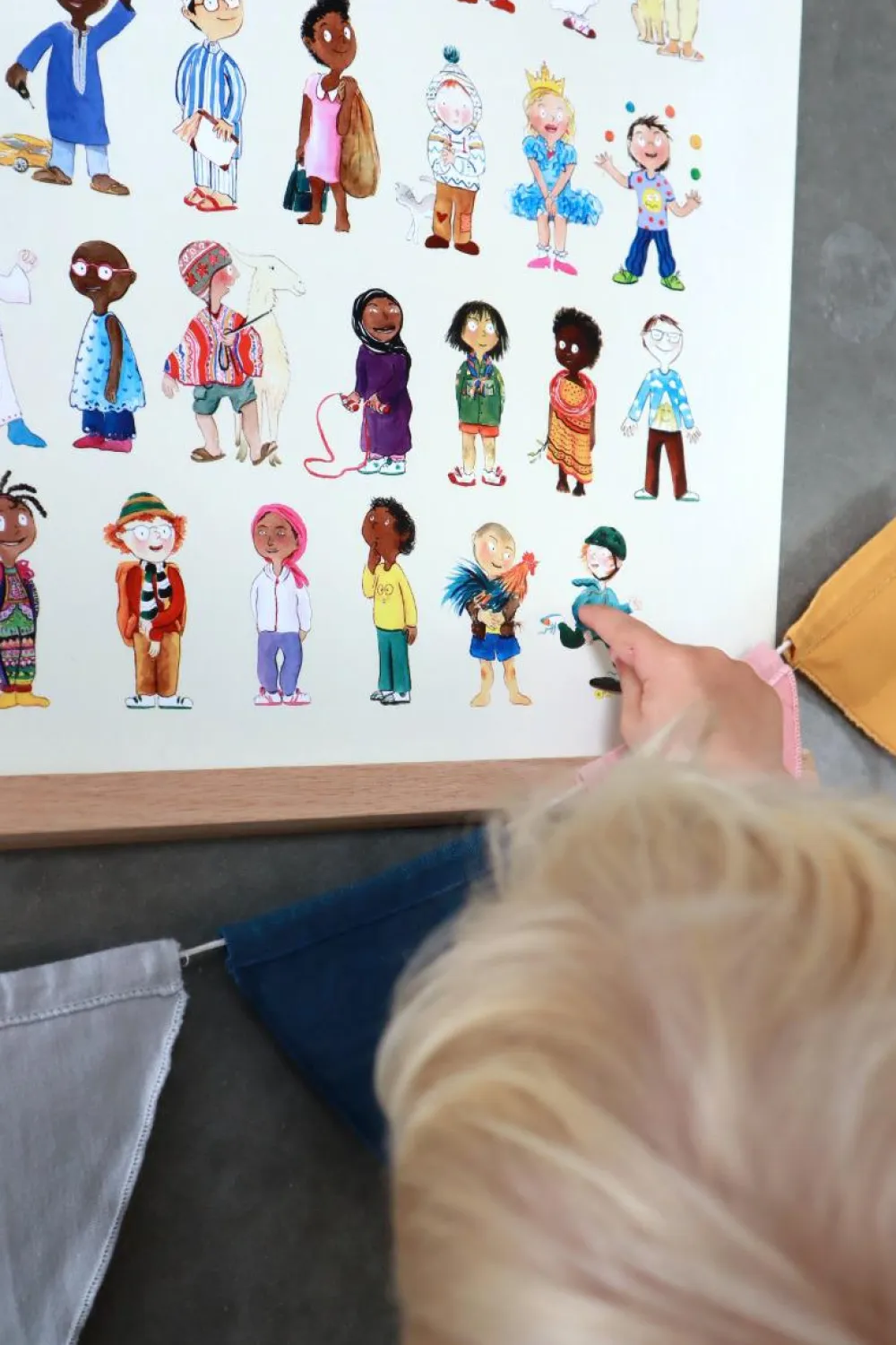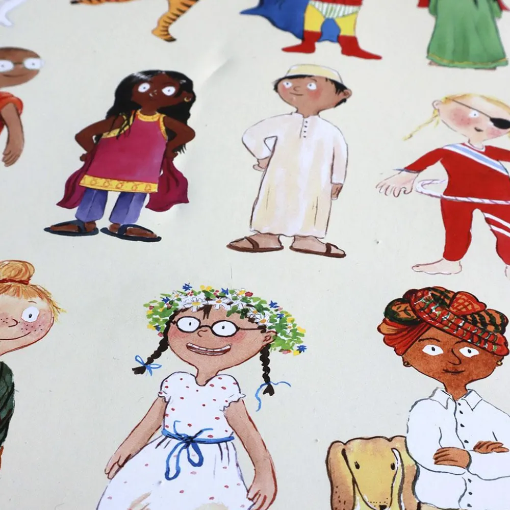 Den er perfekt til sjove snakke eller lege, hvor det gælder om først at finde noget, der begynder med G, finde 4 gule ting eller eller tælle, hvor mange der har noget på hovedet.