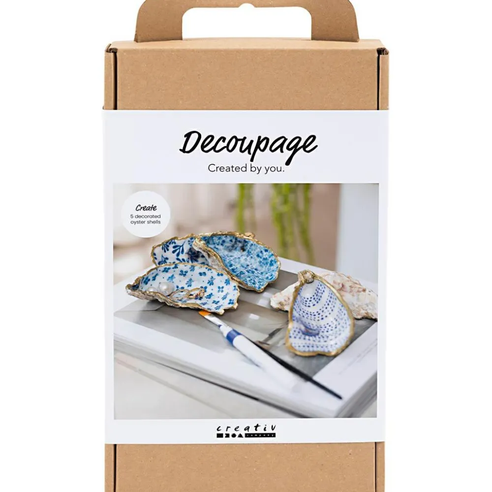 Uanset om du er glad for østers, virkelig gerne vil være fri eller aldrig har smagt én, er skallerne ret fine, og med dette sæt kan de få fint decoupagepapir på og guld rundt i kanterne.
