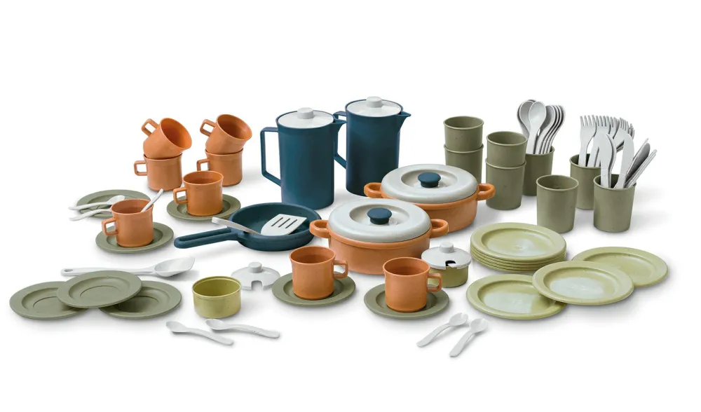 Med dette spisestel af danskproduceret BIOplast, kan en hel gruppe børn dække fint bord og spise et fint, afrundet måltid med kaffe bagefter, serveret med flot service.