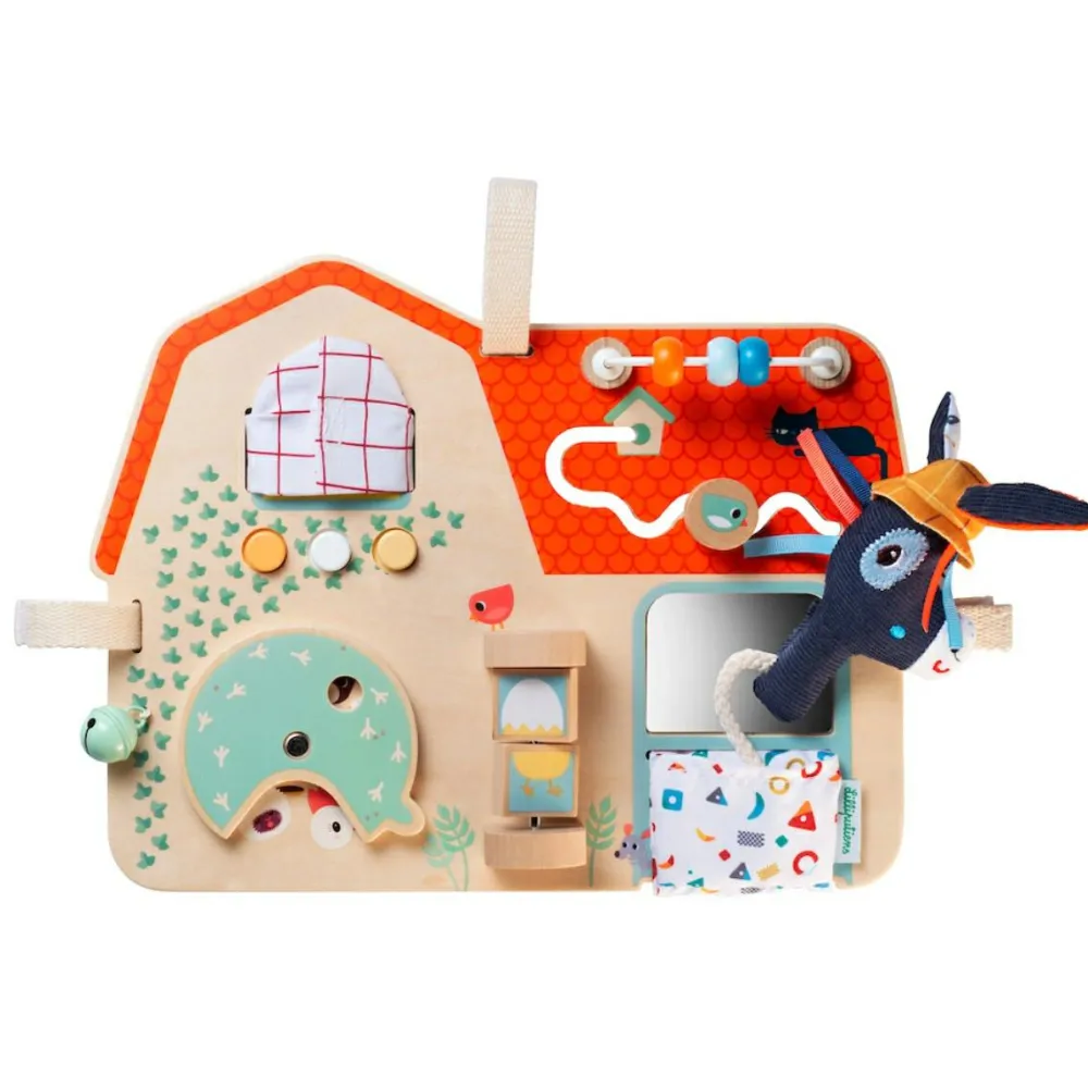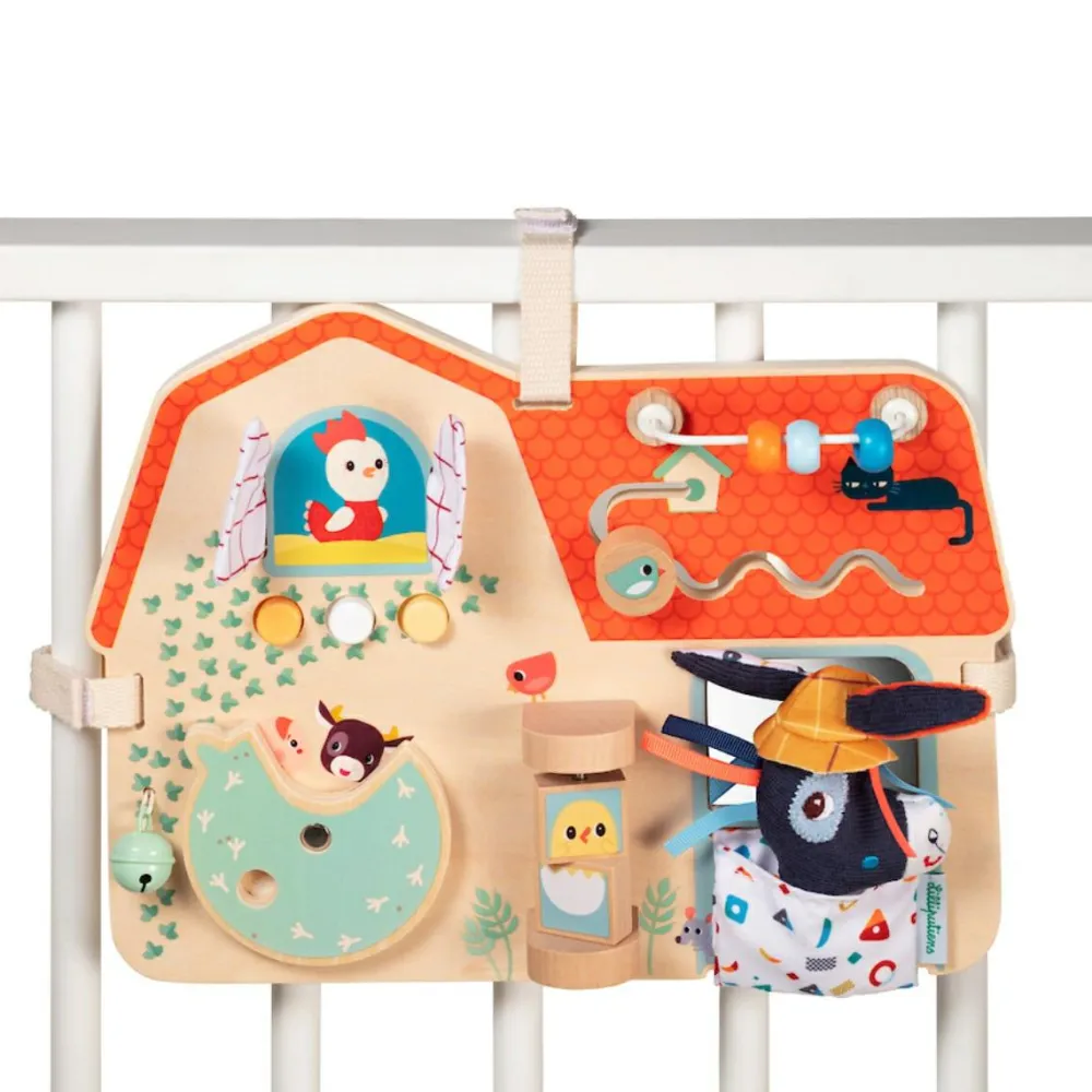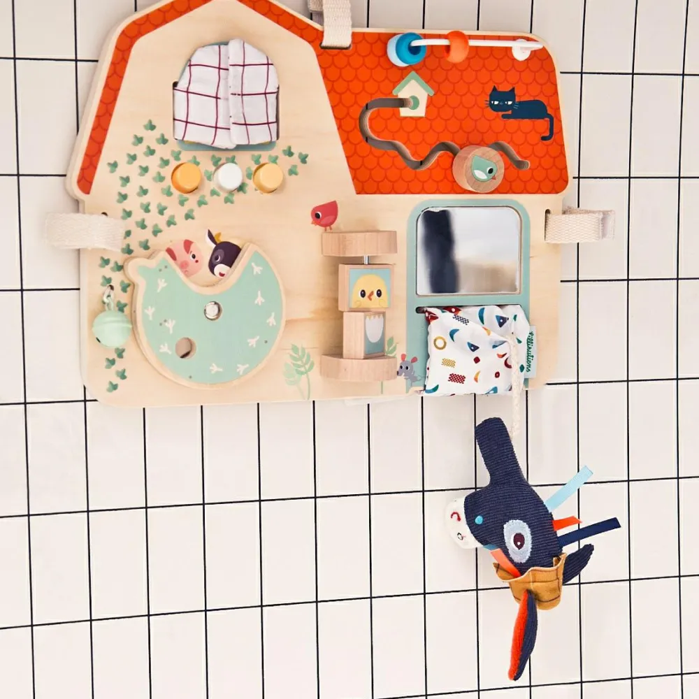 Hæng dette fine aktivitetspanel af træ op på væggen, i legehjørnet, i venteværelset eller andre steder, hvor det er godt at kunne beskæftige sig selv, når man er en lille pilfinger.