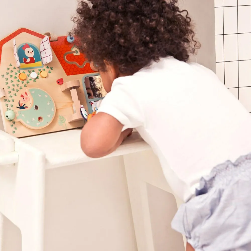 Her kan dit barn stimulere finmotorikken og nysgerrigheden ved at åbne, lukke, hilse på fuglen, se sig selv i spejlet og lege med koen.
