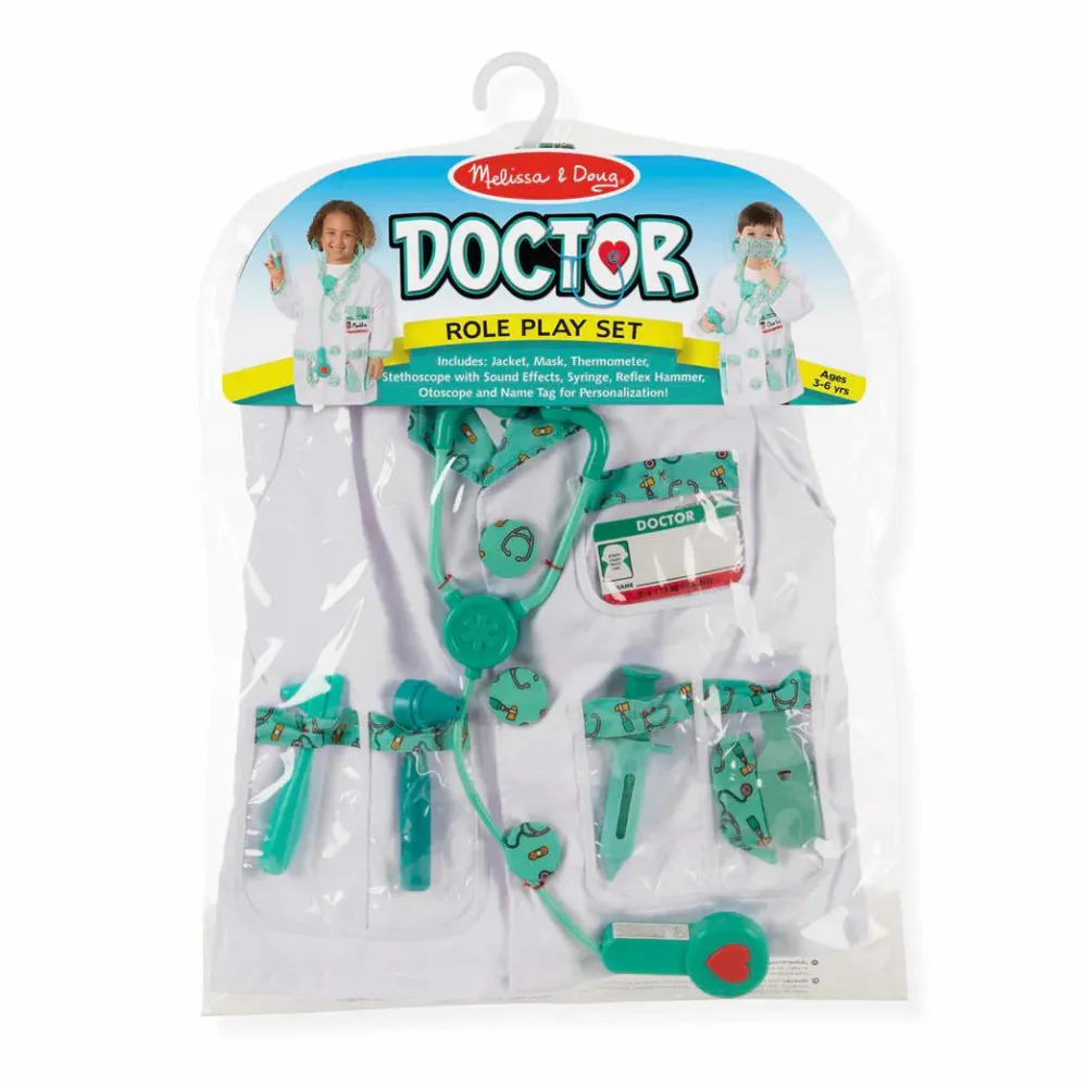 Jakke, maske, stetoskop (med lydeffekter), reflekshammer, sprøjte, navneskilt og ørekikkert.