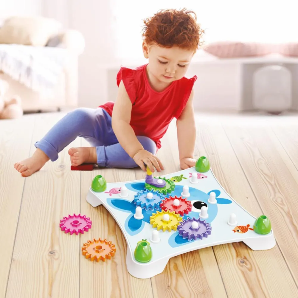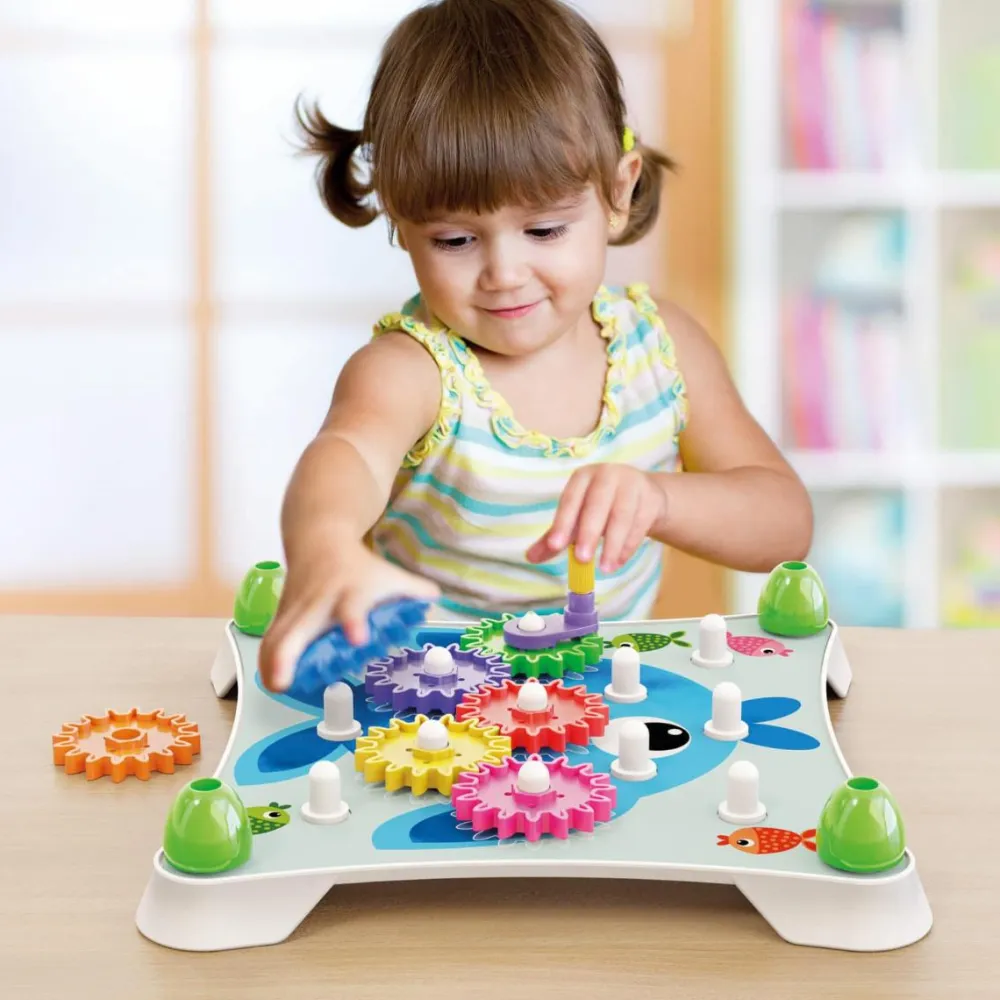Pegge gears er en begyndermodel, hvor dit barn kan sætte tandhjul fast på forskellige baggrunde og finde ud af, hvordan man får hjulene til at bevæge sig sammen.