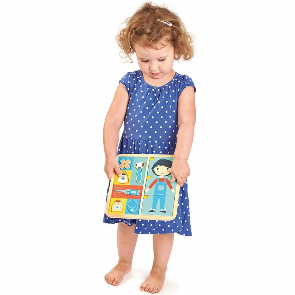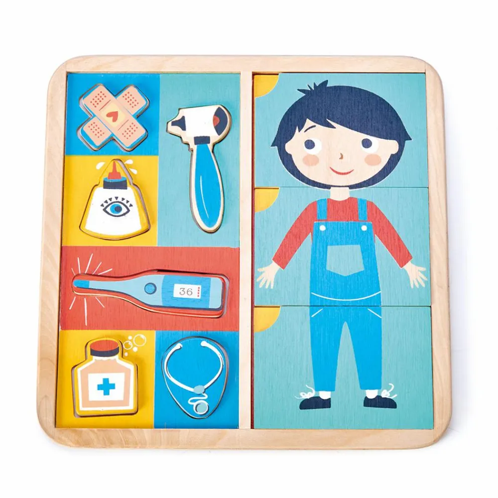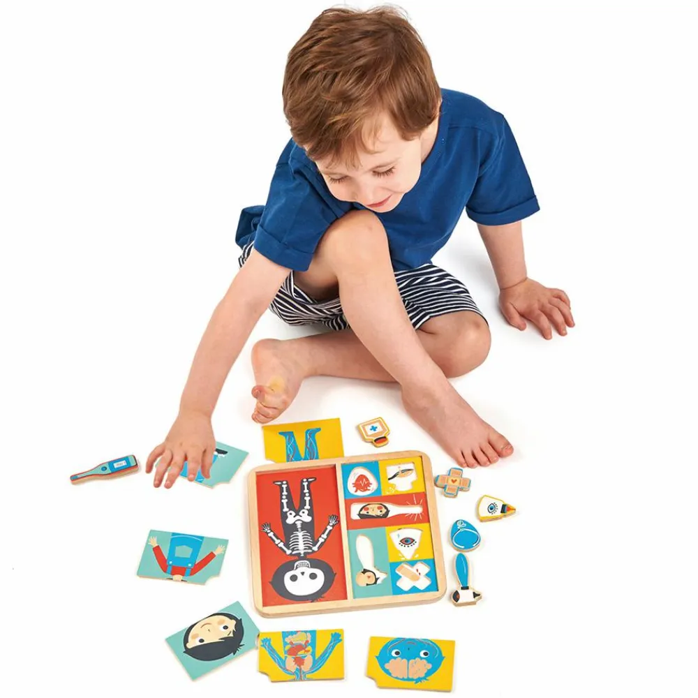 Det udvider dit barns viden og ordforråd at snakke om, hvornår man fx bruger plaster, og hvad medicin er for noget, mens brikkerne falder på plads.