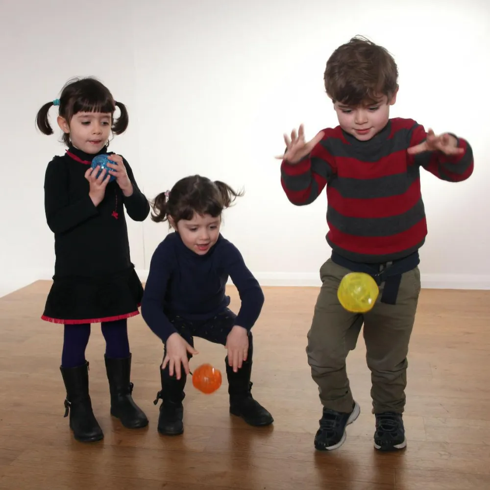 Disse hoppebolde har taktile overflader, der stimulerer dit barns følesans og lader bolden hoppe i uventede retninger.