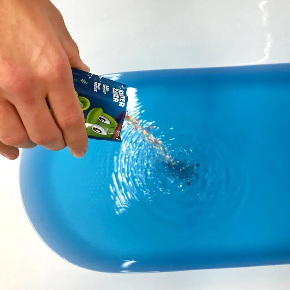 Hæld posens indhold langsomt ud i badevandet, og hør, hvordan de små farvede korn begynder at knitre.
