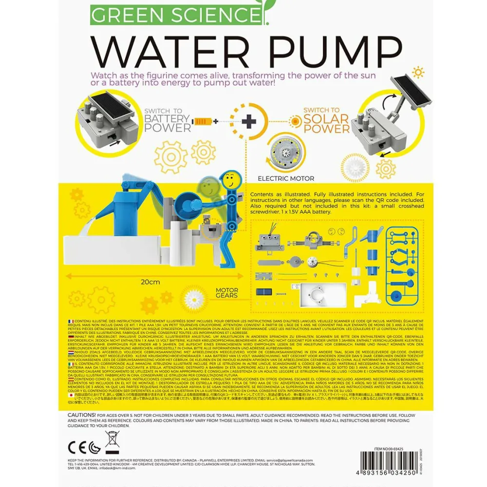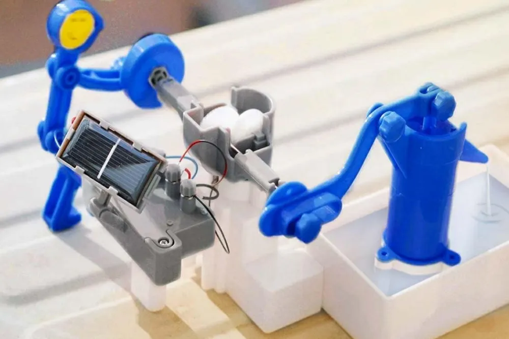 Princippet bag er energioverførsel. Solens energi overføres ved hjælp af dette lille byggesæt til en pumpe, som får vandet til at løbe i den ønskede retning.