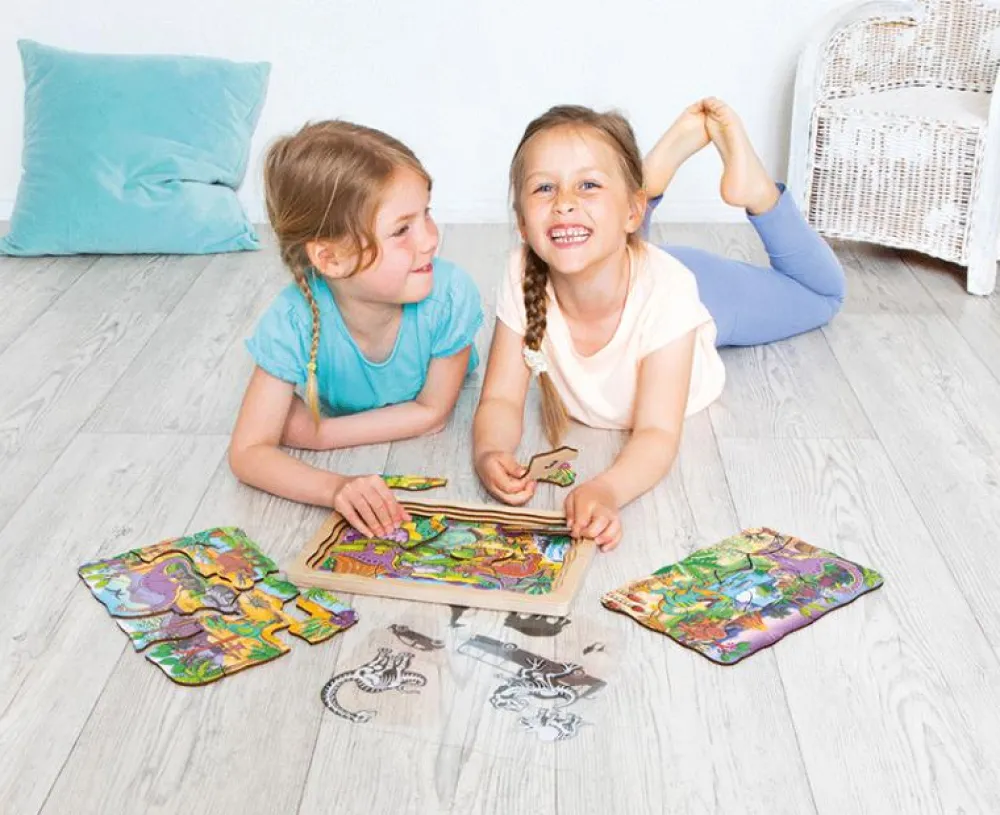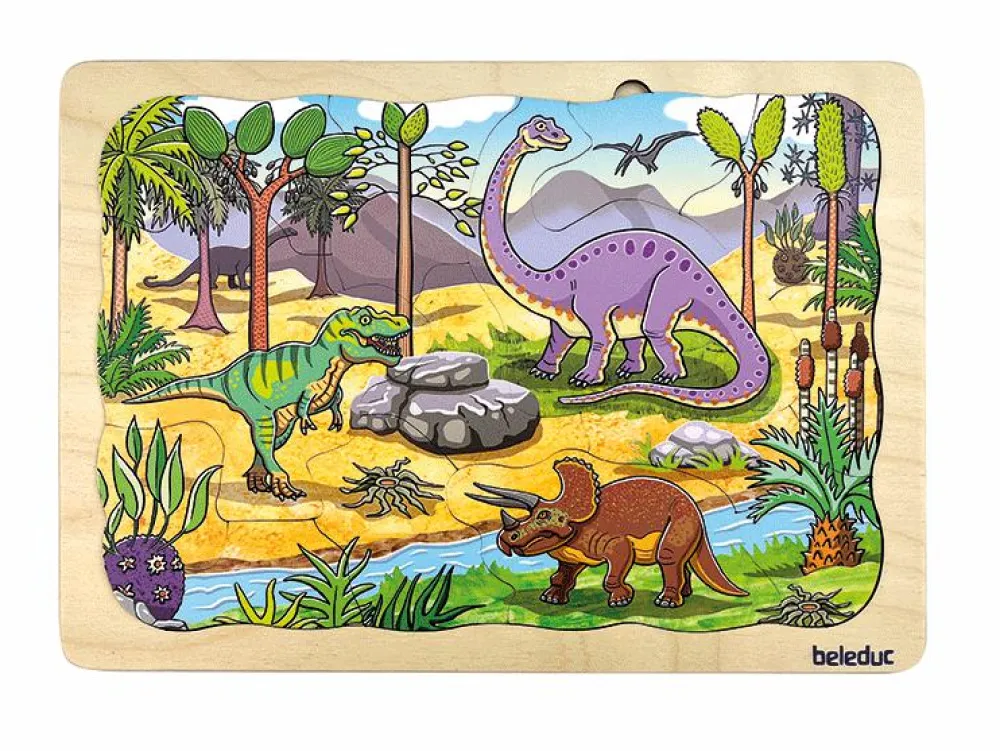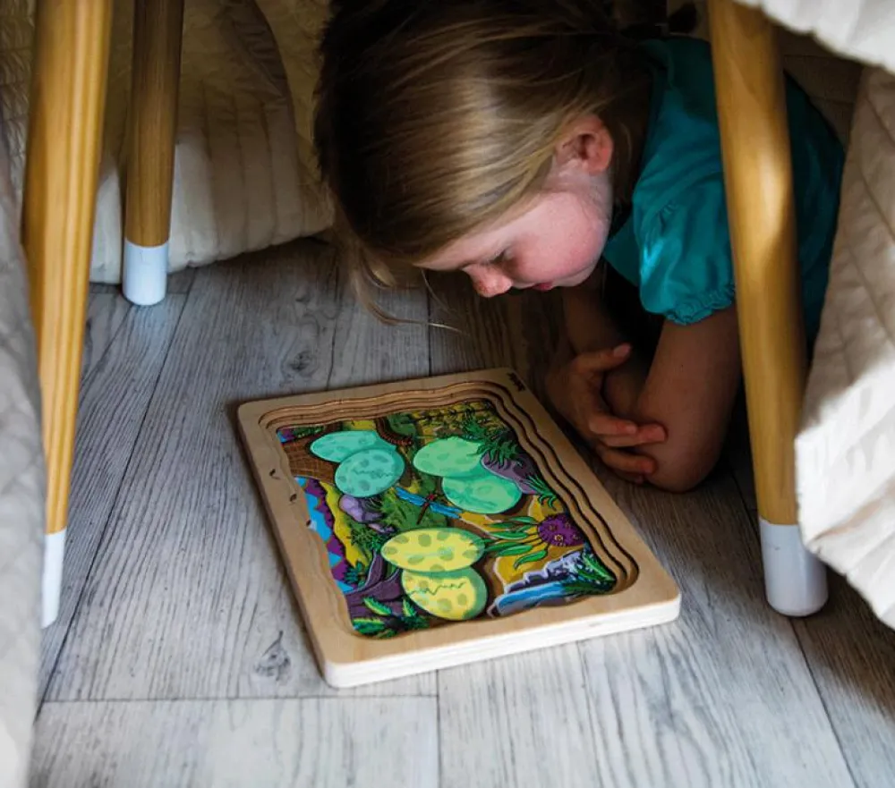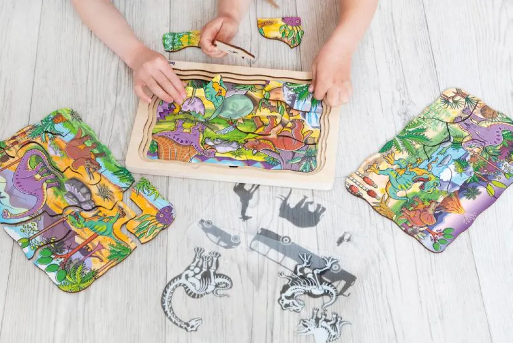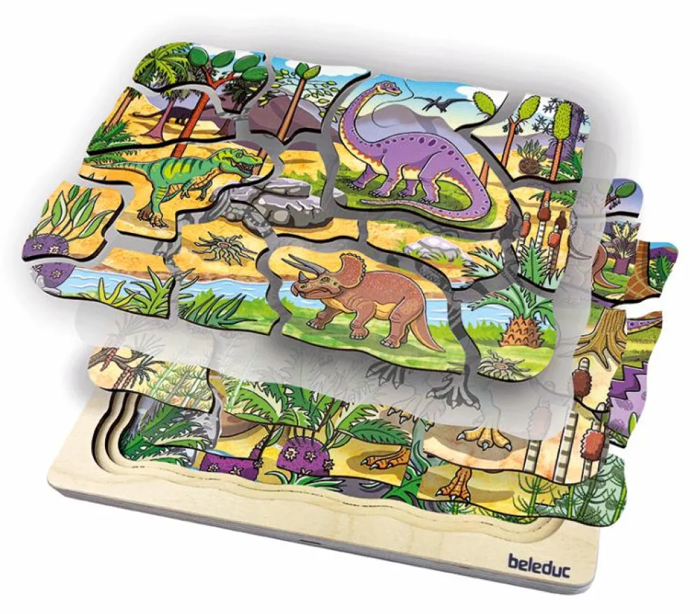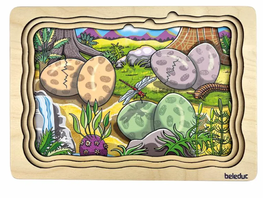 Puslespil i 4 lag. Det ene lag viser tre dinosau-æg der er klar til at klække, mens de næste lag viser dinosaurernes knogler, dinosaurerne, der vokser op og hvor store de har været sammenlignet med en bus eller bil.