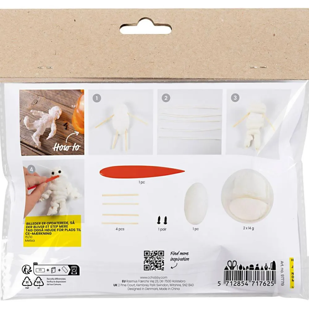 BYg denne fine mumie op med “indvolde” af styroporkugler og ydre beklædning med selvhærdende Silk Clay® og Foam Clay® og et par plastøjne, så den kan se noget.