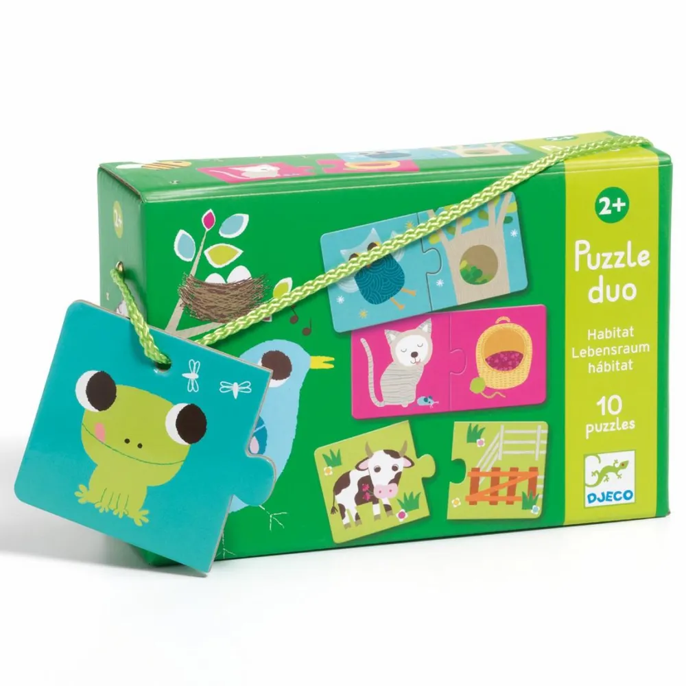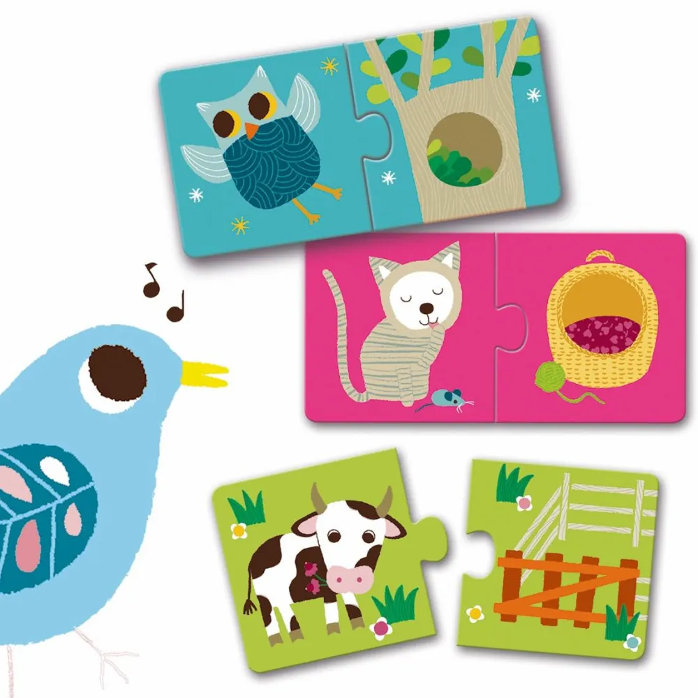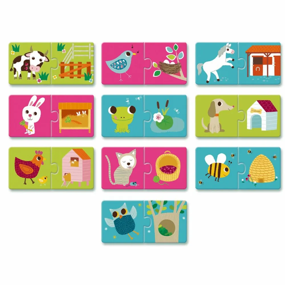 Hyggelige små puslespil, hvor det gælder om at finde ud af, hvor dyret mon bor henne.