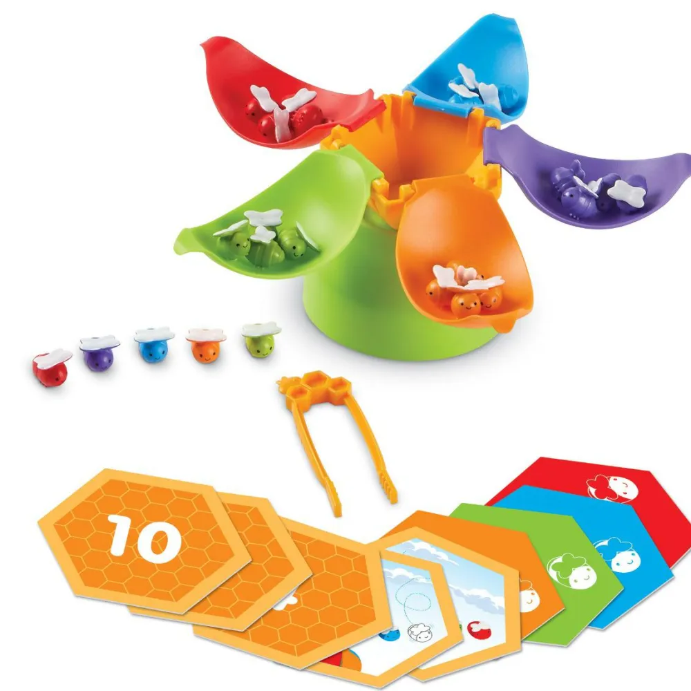 Med aktivitetskortene og pincetten kan dit barn øve sig i at finde den rigtige farve bi og hjælpe den med at lande på det rigtige blad.
