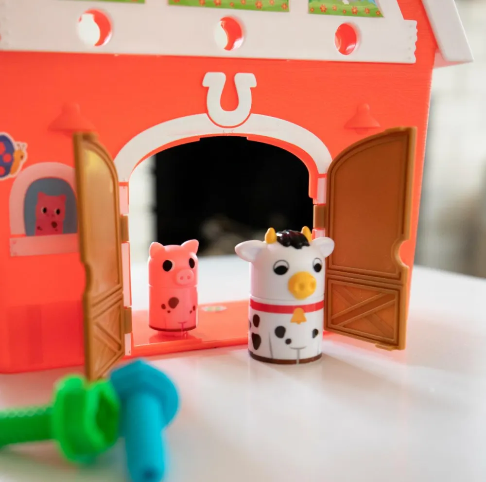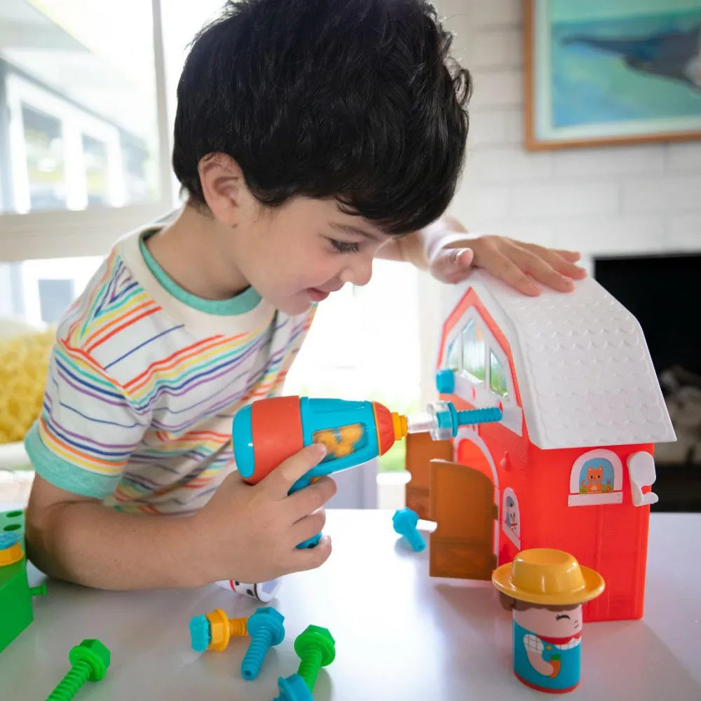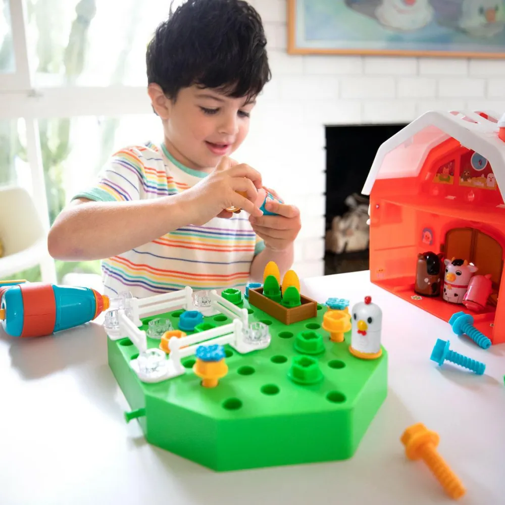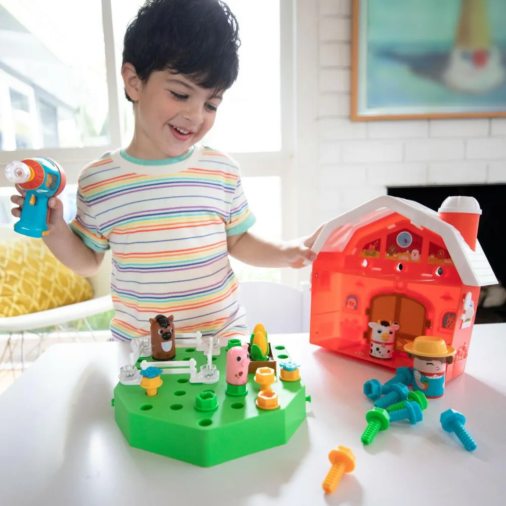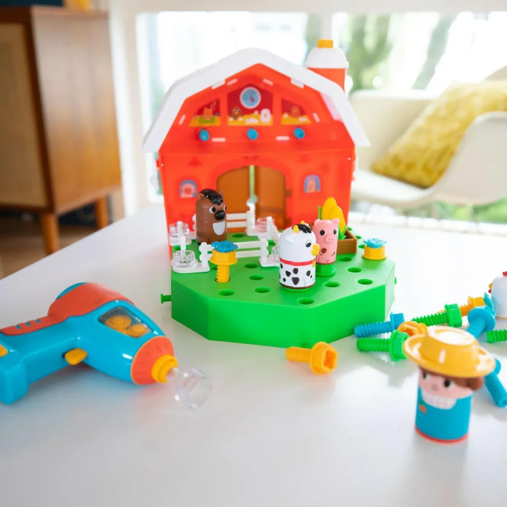 Her mødes rolleleg og byggeleg i fin forening, når bondens mark skal beplantes ved hjælp af den seje elektriske skruemaskine. Den bruger to AA-batterier, som ikke følger med.