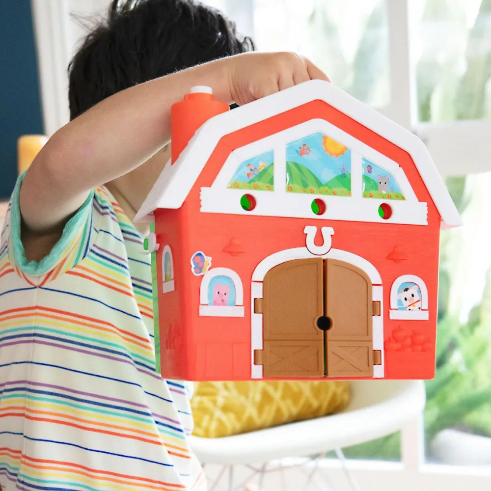 Med lade, 24 kulørte bolte, bonde, bondegårdsdyr og en indhegning til dem samt mark med bolt-grøntsager.