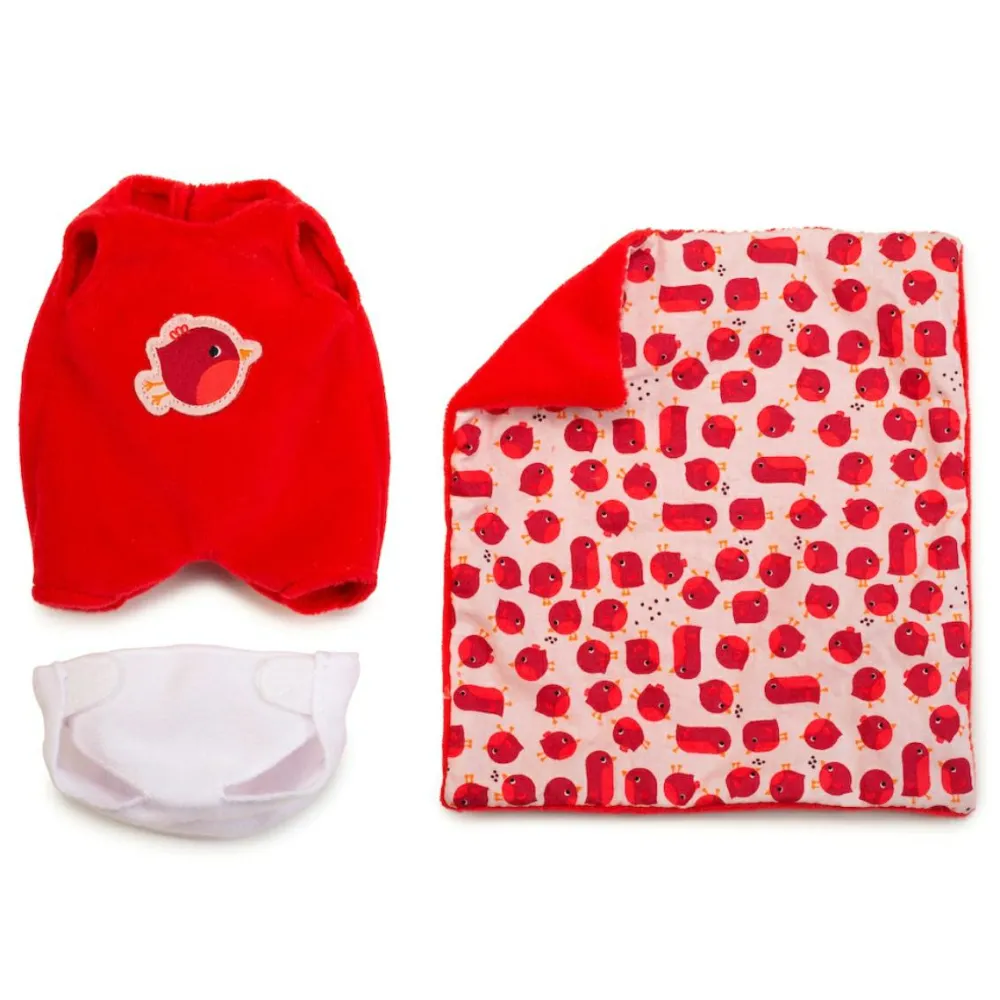 Agathe er en sød og blød dukke i stof med ble og dragt, som dit barn kan øve finmotorikken på ved at tage tøjet af og på om og om igen.