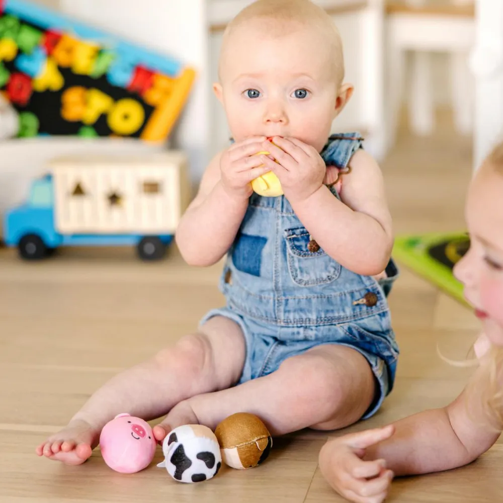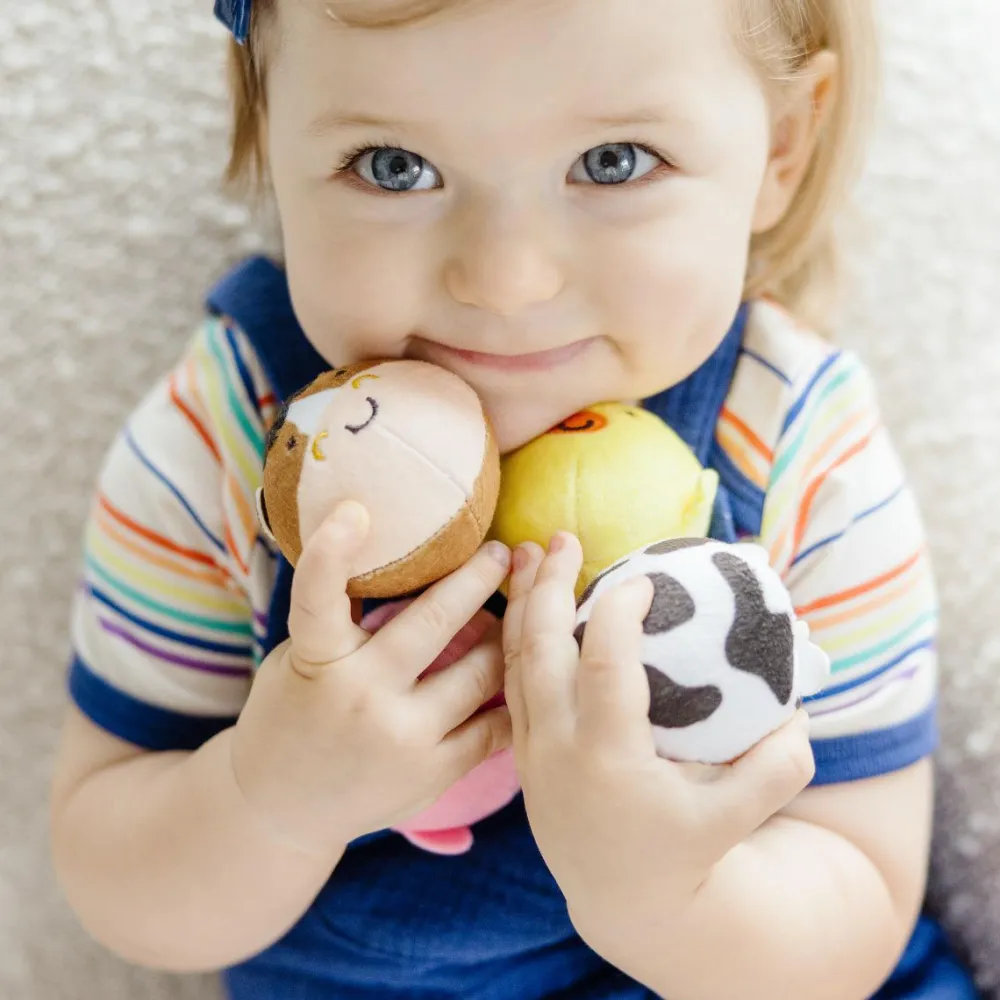 Bløde og lækre babybolde med bondegårdsdyr: Ko (med bjælde), høne, gris og hest.