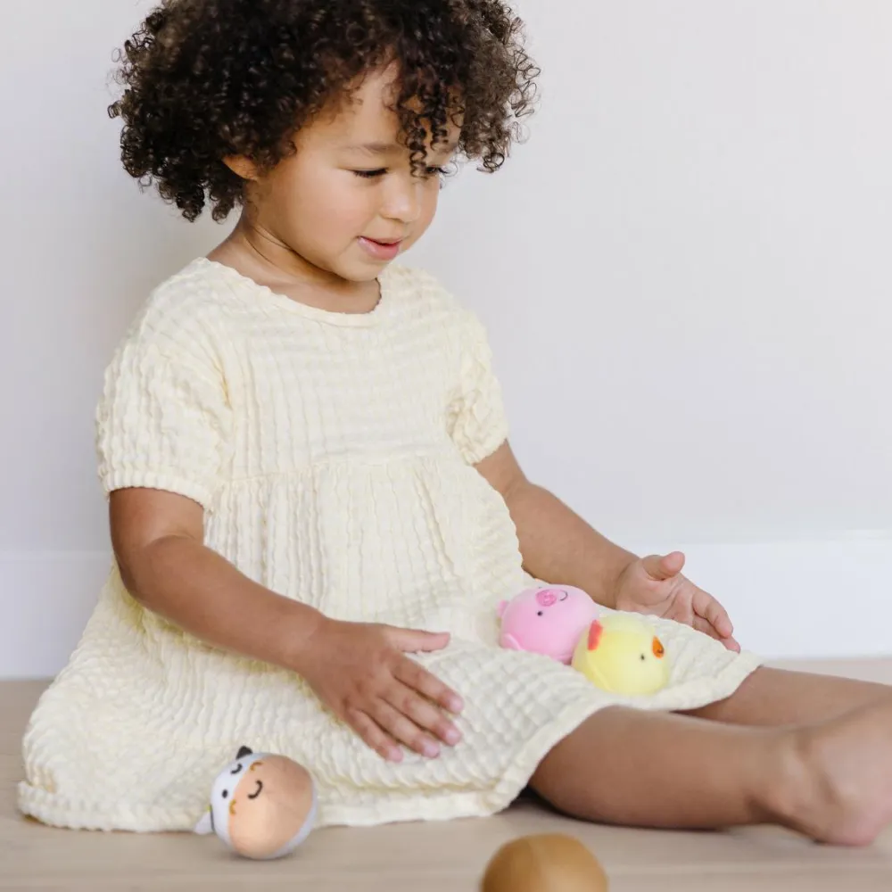 Boldene er nemme at holde om for små hænder, der stadig bliver dybt forundret over at kunne samle dem op og kaste med dem.