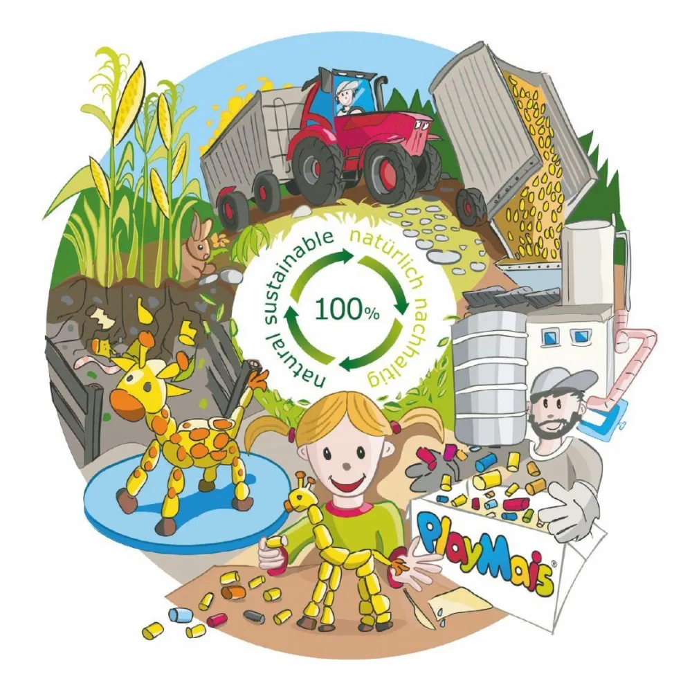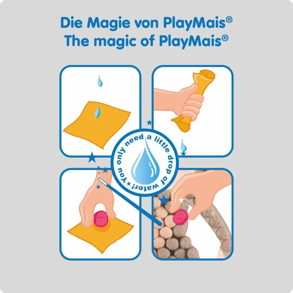 I tager simpelthen en PlayMais i hånden, og så skal dit barn mase eller mose eller skære den lille majs dut i den ønskede facon, fugter den på en våd svamp og klæber den fast der, hvor dit barns kreativitet siger, at den skal sidde. Klæbeeffekten opstår, når stivelsen i majsstivelsen møder vand. PlayMais har modtaget et væld af priser verden over . De er 100% komposterbare, biologisk nedbrydelige, CO2-neutrale og faktisk kan man spise dem.