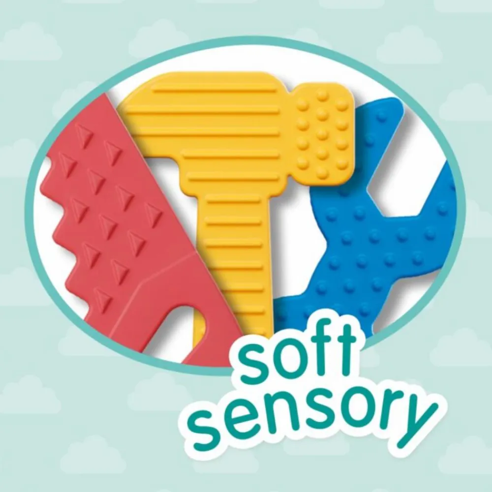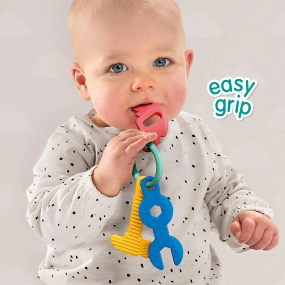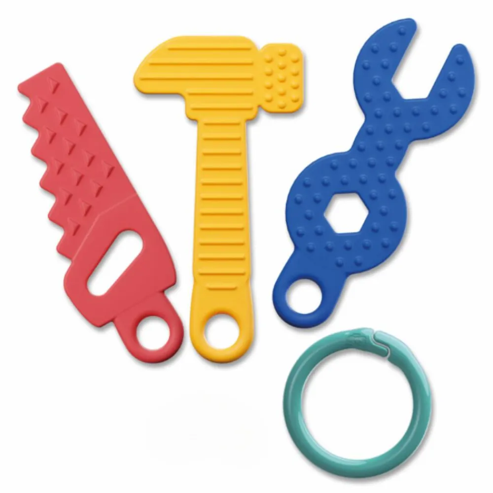 Kan man gumle på en sav? Ja her er både sav, skruenøgle og hammer, som er dejligt for de yngste at putte i munden.