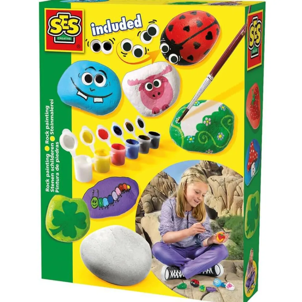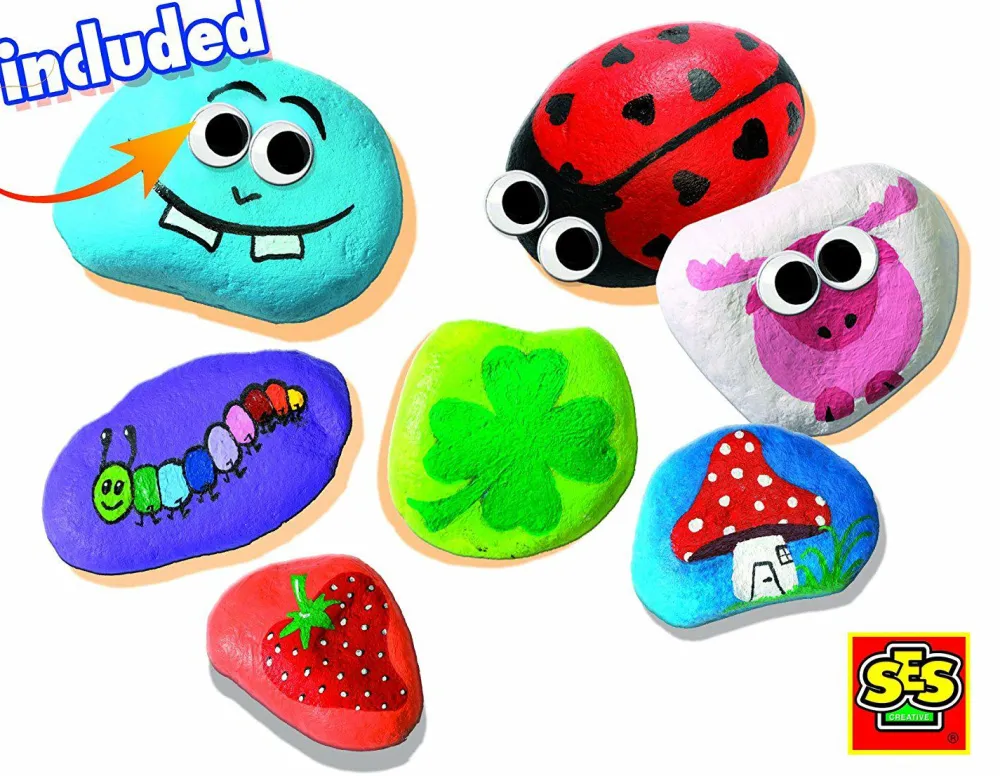Derudover får du dekorationsmaling, pensel og lim til at lime “øjne” på “stenene”