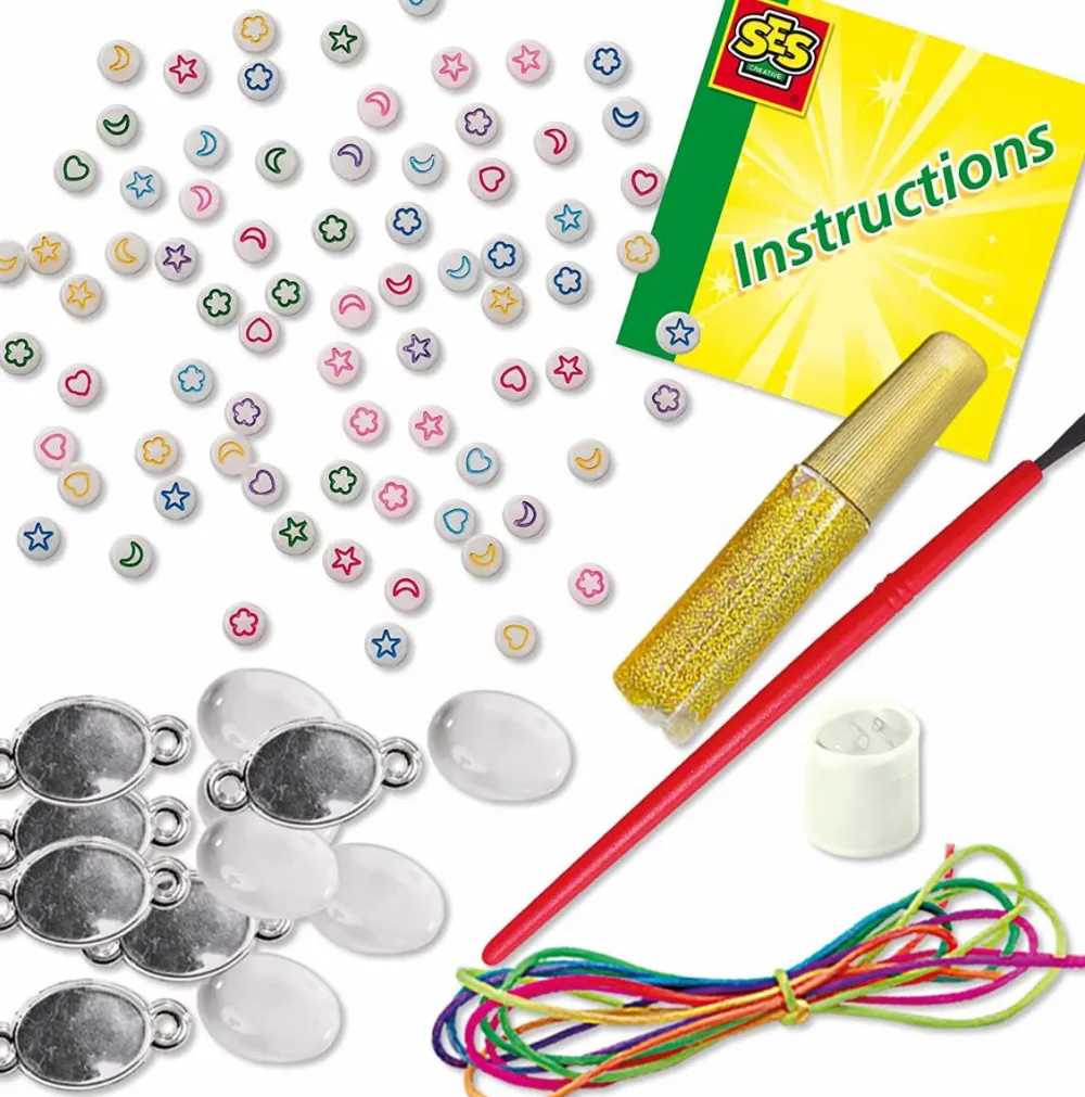 Dit barn sætter de fine perler på elastiksnor, men der er også mulighed for at lave vedhæng, der kan åbnes og dekoreres indeni med glimmer og små ikoner.