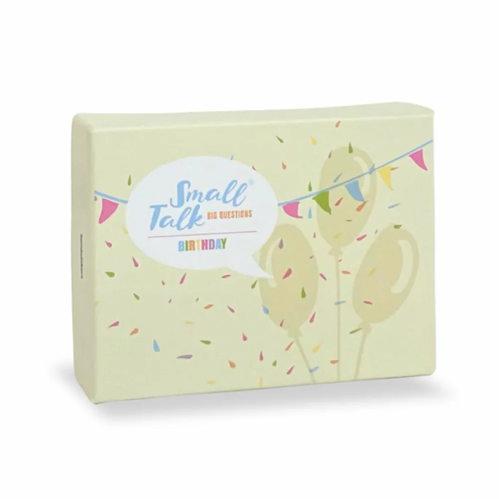 På denne udgave af Small Talk- Big Questions er der på den ene side af kortene et spørgsmål, der handler om fødselsdage og andre festligheder, og så starter man en samtale eller dialog med det spørgsmål.