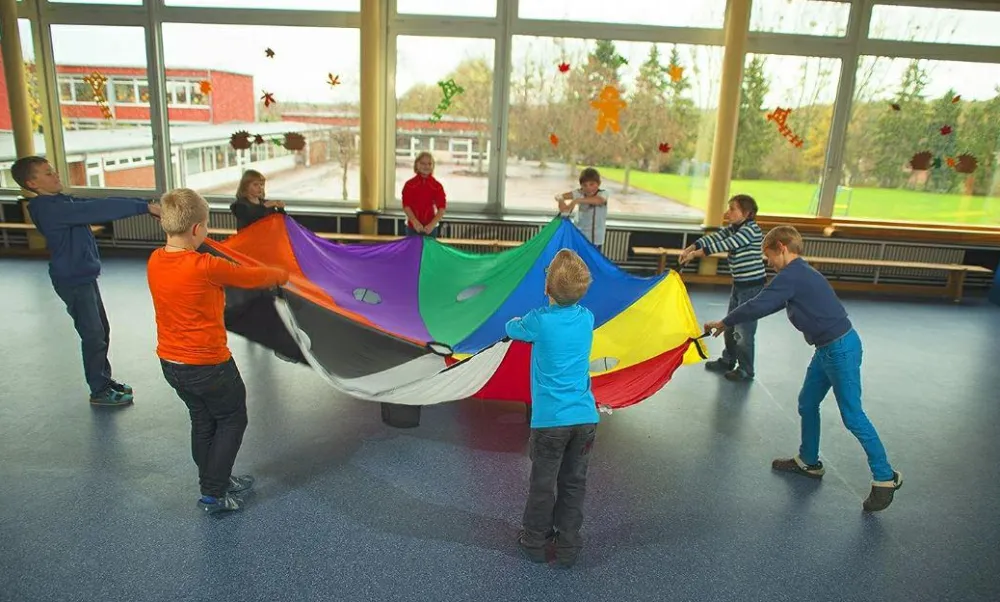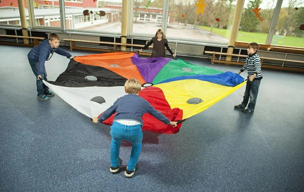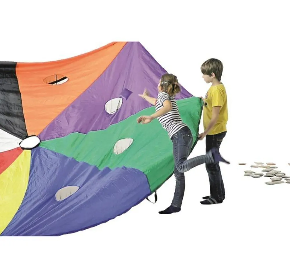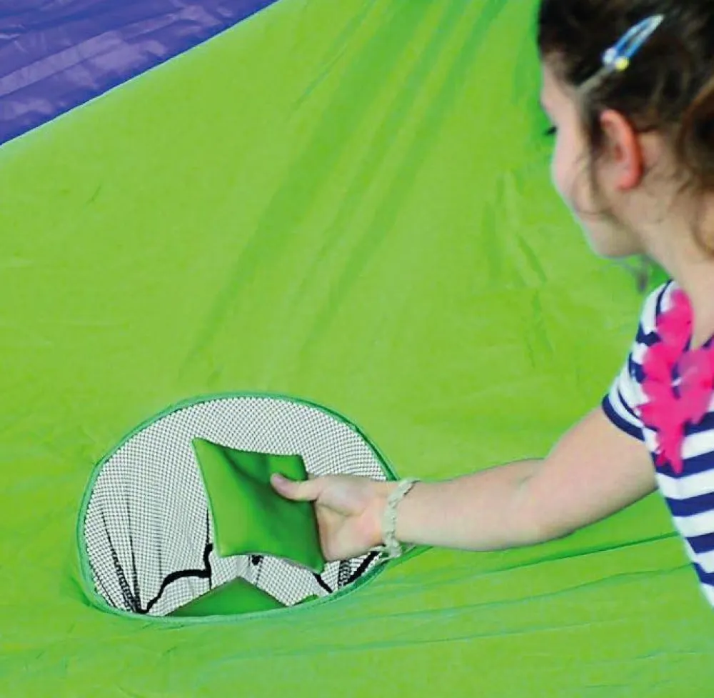 I faldskærmen er der også huller med net i, så I kan kaste til måls med fx ærteposer.