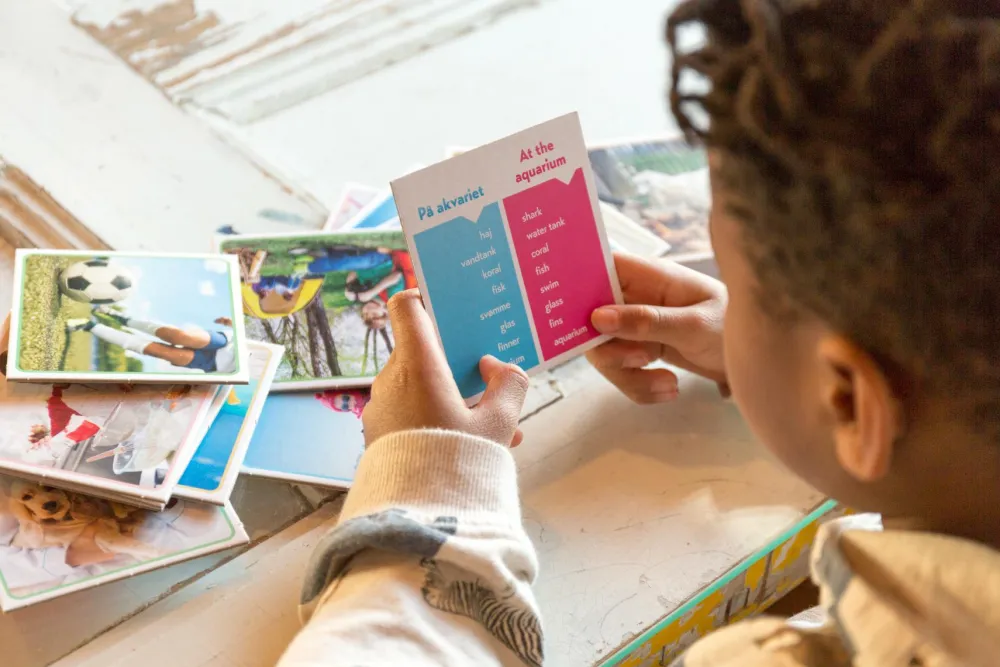 På kortene står der ord og sætninger på engelsk på den ene side af kortet, og så står oversættelsen på den anden side. I bestemmer selv, om dit barn skal prøve at sige det danske eller det engelske først.