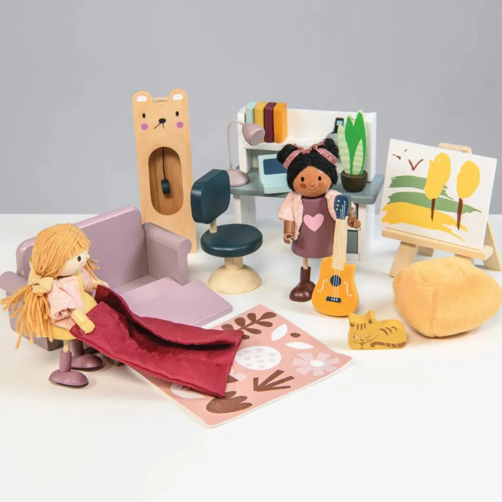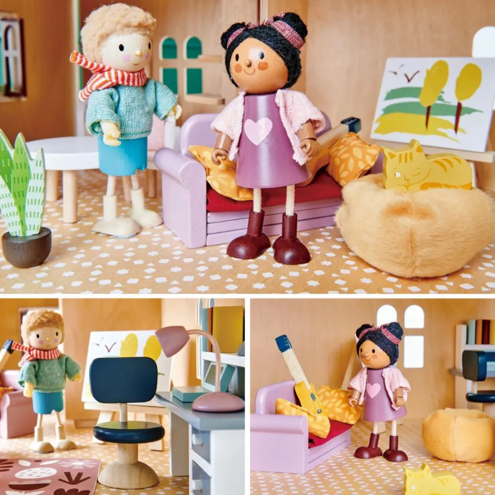 Her kommer dit barns dukke ikke til at kede sig. Den kan blandt andet øve sig i guitar, lære at male, nusse katten, tage en lur på udtrækssofaen og skrive opgaver på computeren – eller finde på diverse overspringshandlinger.