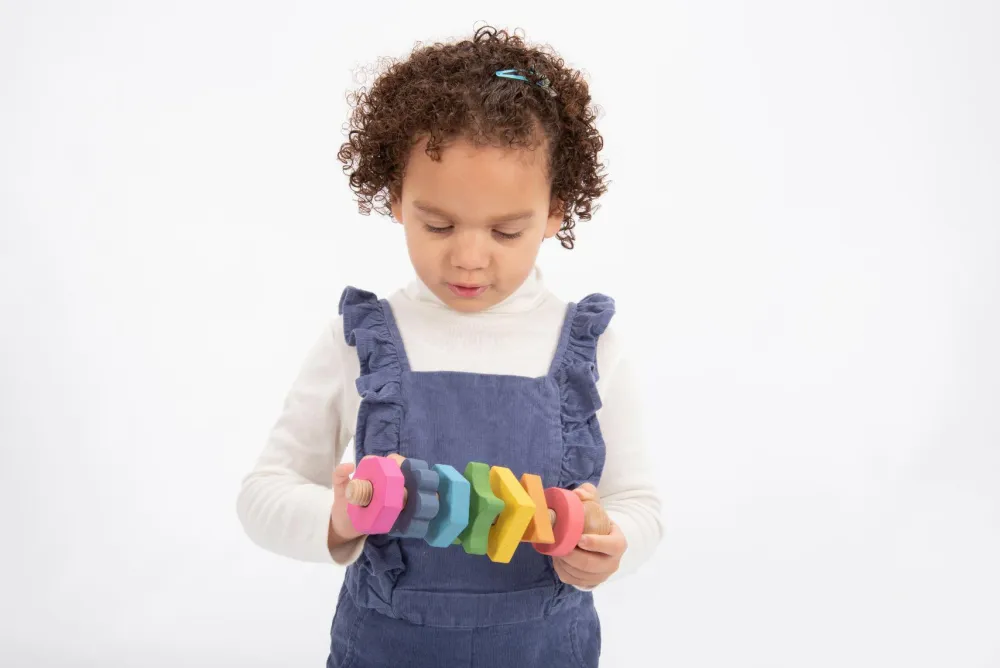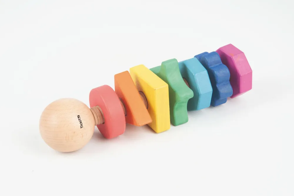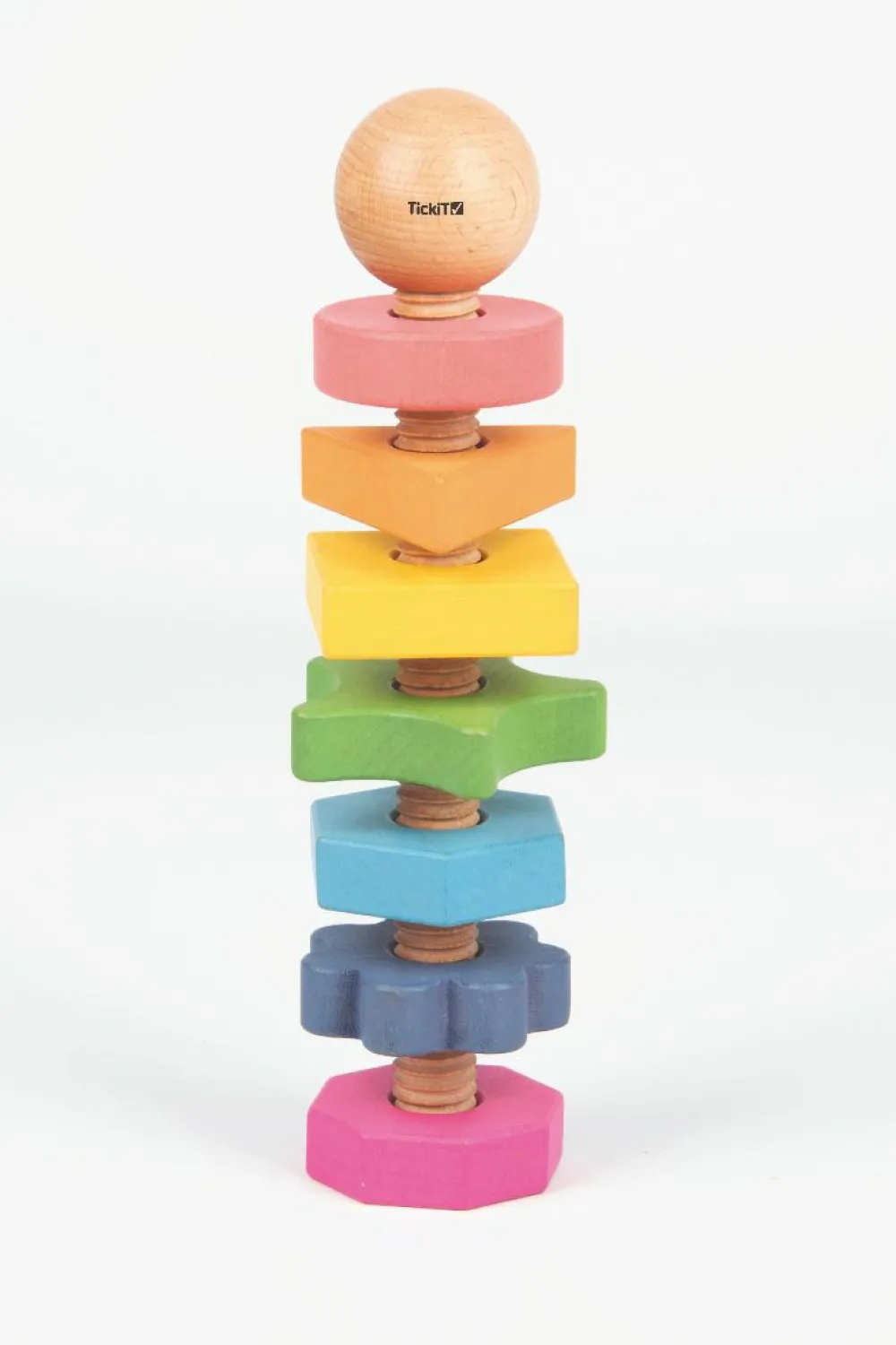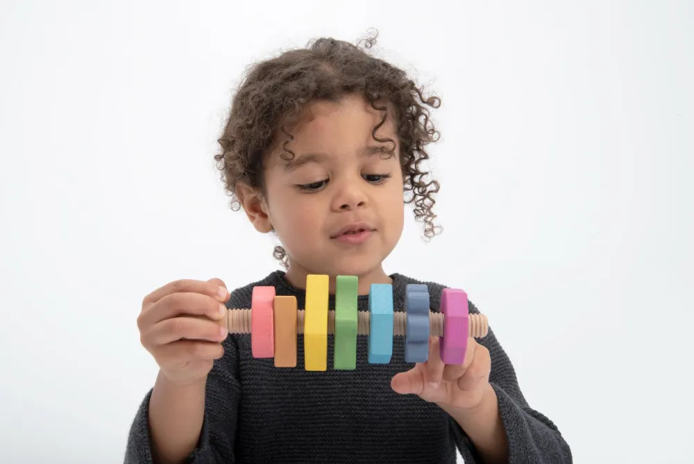 Så kan der skrues. Her er en stor bolt og hele 7 møtrikker, som dit barn kan skrue af og på igen og igen. Møtrikkerne har forskellige former og farver, og er derfor gode til at lære farvegenkendelse.