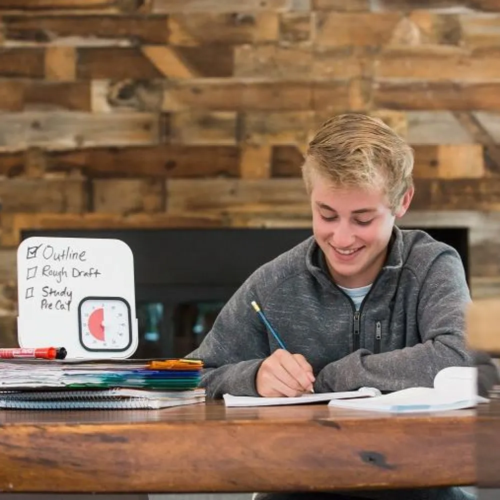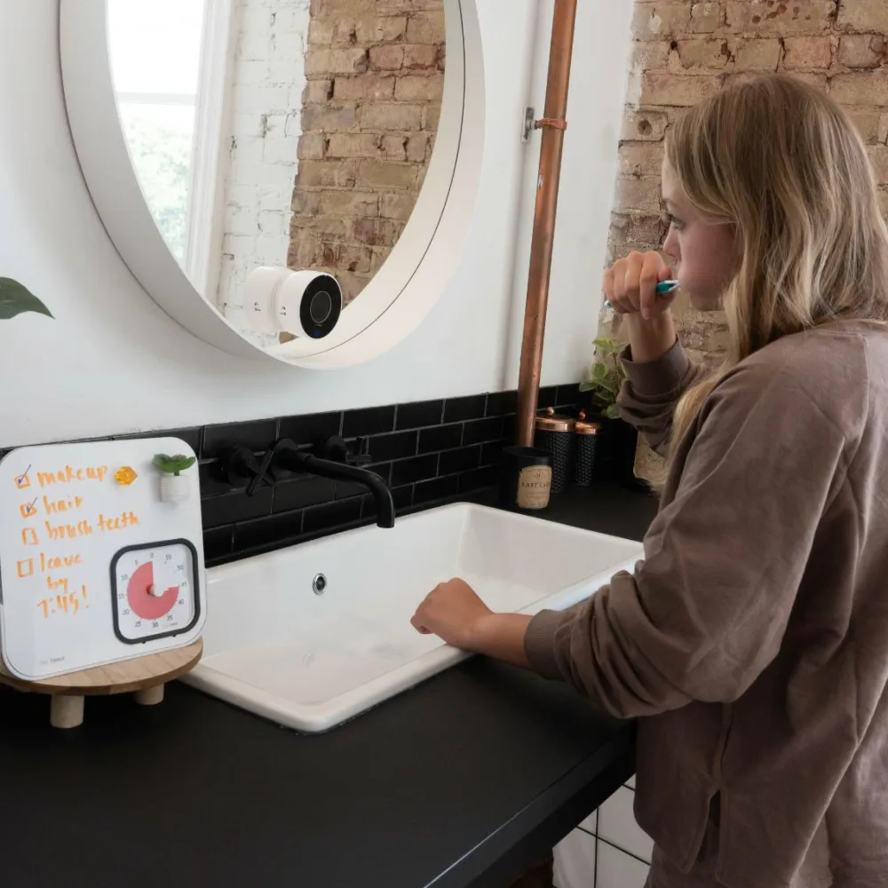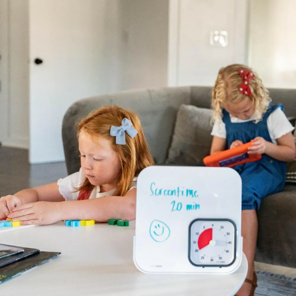 Her er den klassiske Time Timer, som sidder i et whiteboard. Der kan du fx notere eller tegne, hvad opgaven går ud på, eller hvad der skal i aftensmaden, dit barn er igang med. Mulighederne er mange.