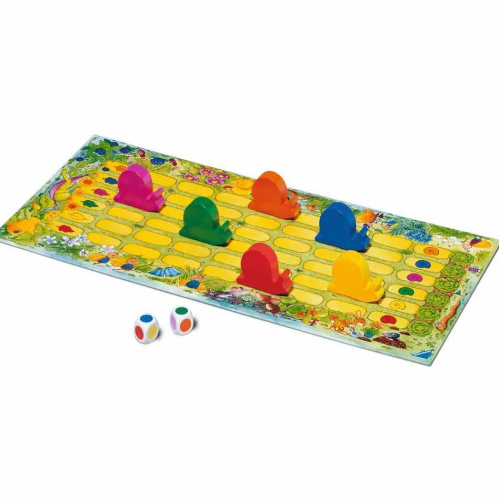 Tril de kulørte terninger og se, hvilken snegl der kommer først hen og kan gumle sig mæt i salat.