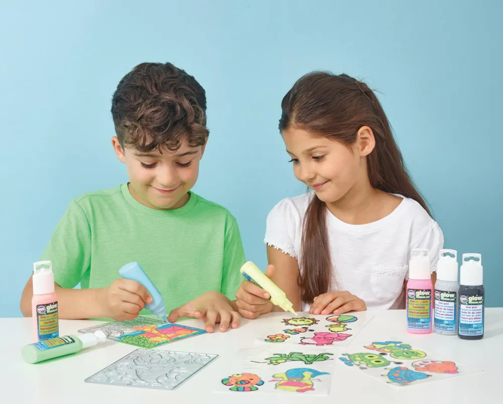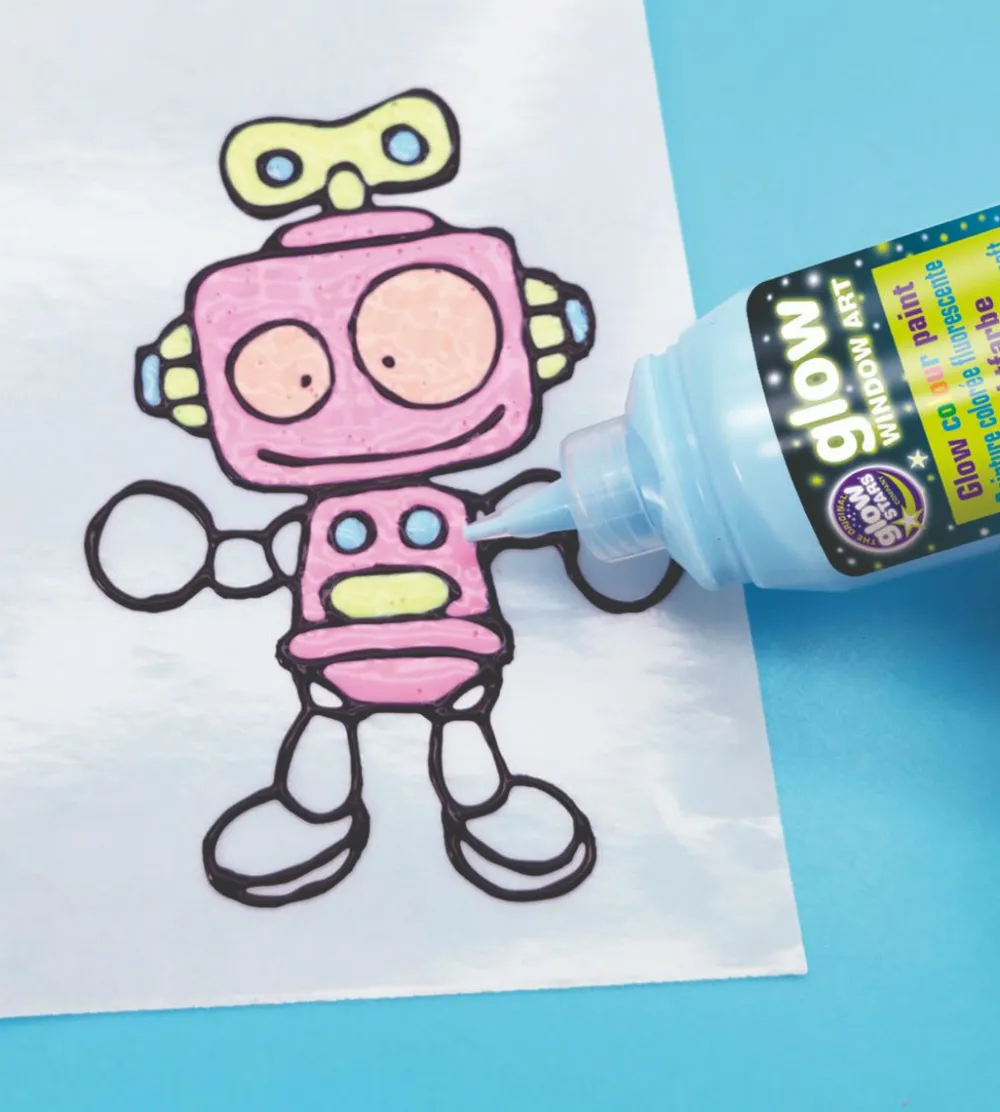 Brug en linerfarve til at optegne omridset og farv derefter med de selvlysende farver. Lad det tørre godt, inden I tager det forsigtigt af.