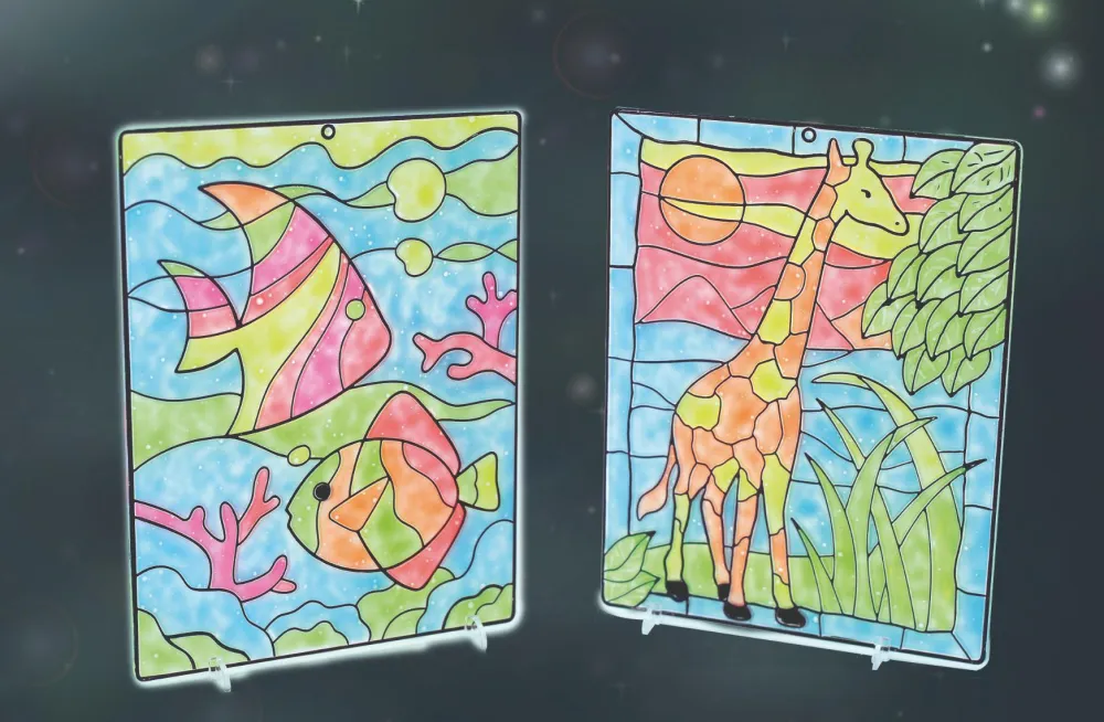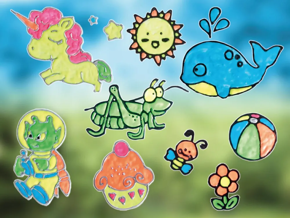 Dekorer vinduerne med flotte vinduesmalerier. I pakken er der 60 forskellige skabeloner, som dit barn kan vælge mellem, men det er selvfølgelig også muligt at bruge fantasien til at tegne noget selv.