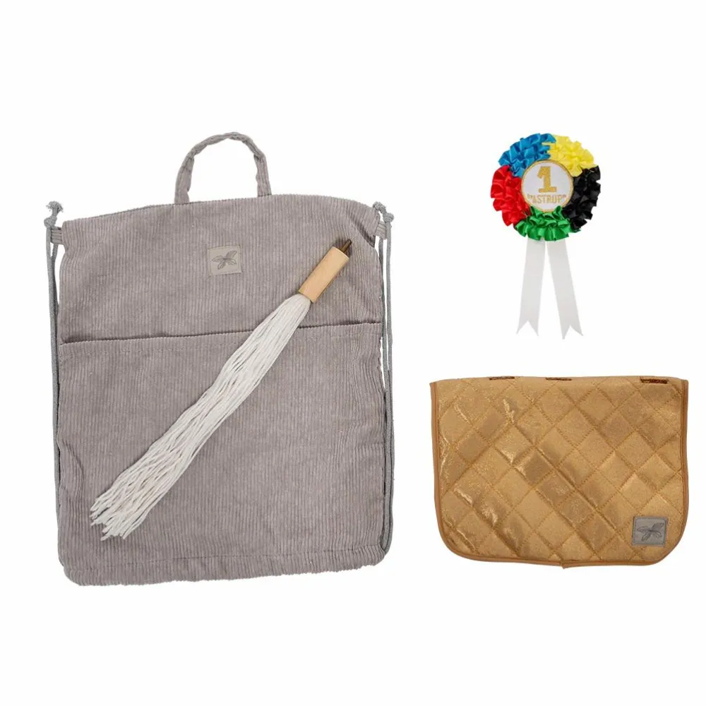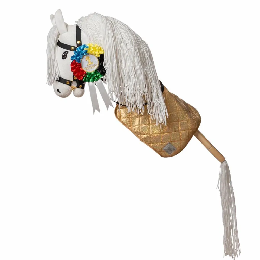 Kæphesten her kommer med seletøj, så du ikke skal spekulere på, hvilket hovedtøj der passer til hvilken kæphest. Desuden får du guldfarvet sadelunderlag, hestehale dit barn kan skrue af og på og en rygsæk at fragte OLGA rundt i.