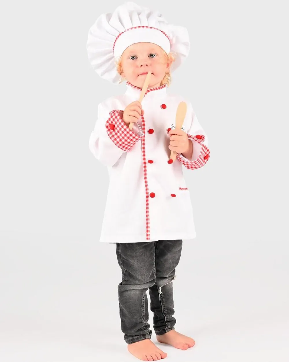 Kostumet kan også bruges, når dit barn skal hjælpe til med aftensmaden eller fødselsdagskagen, men så anbefaler vi at bruge et forklæde. Det gør de professionelle kokke jo også.