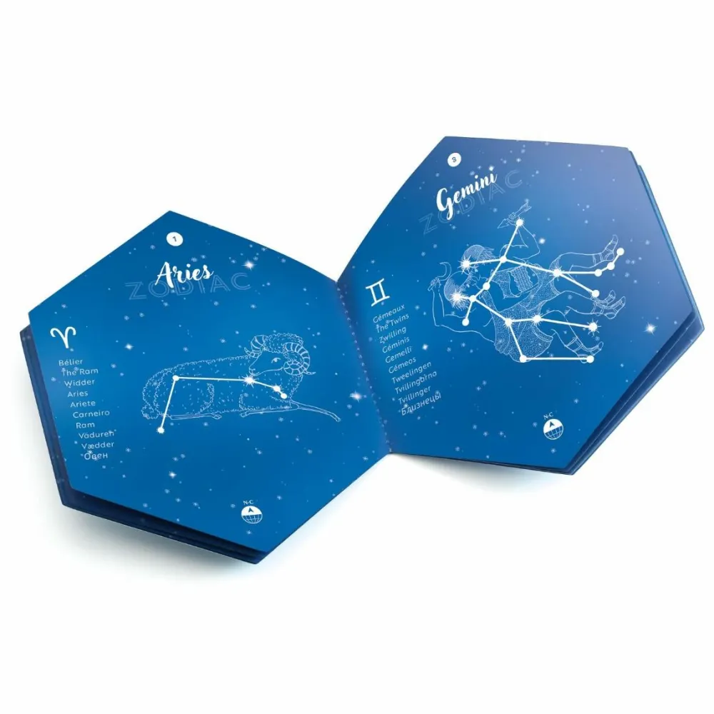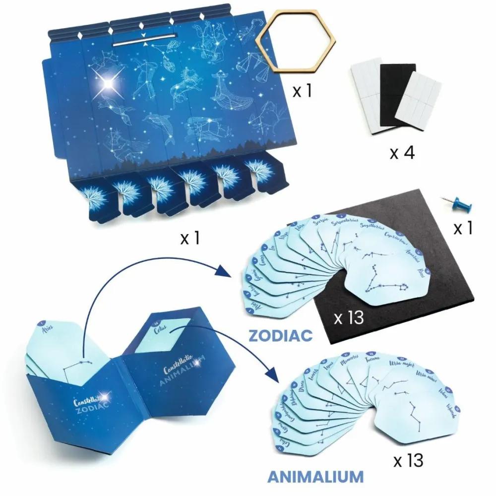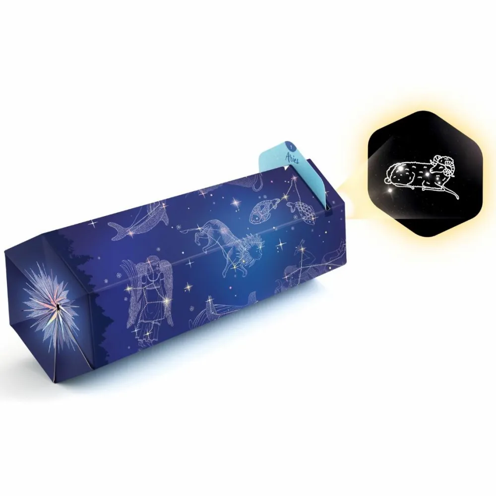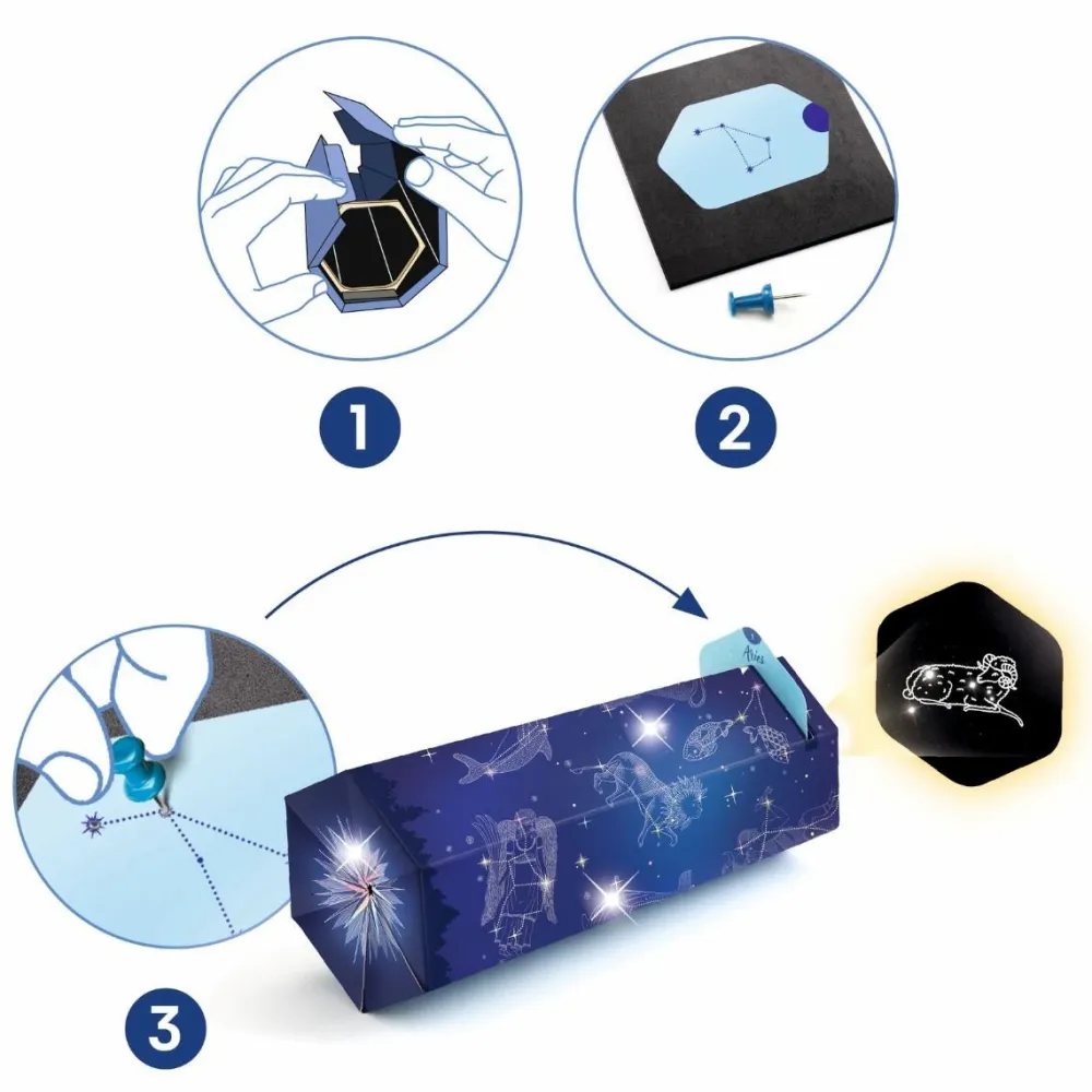 Lær om stjernebilleder og lav din egen fremviser af stjernebilleder med sættet her. Lad dit barn tage et kort og prik med nålen i de huller, der er markeret på kortet. Bagefter skal I sætte kortet ind i sættets fremviser og så kan I se stjernebilledet, som før var skjult.