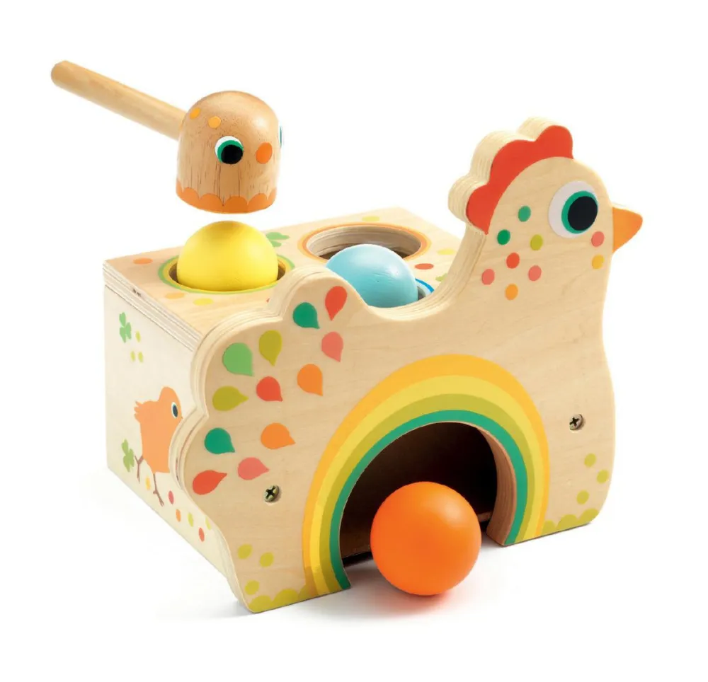 Herlig hammerhøne af træ i fint design, hvor det gælder om, at dit barn skal slå de 3 kugler ned i gennem hønen og de dem trille ud igen.