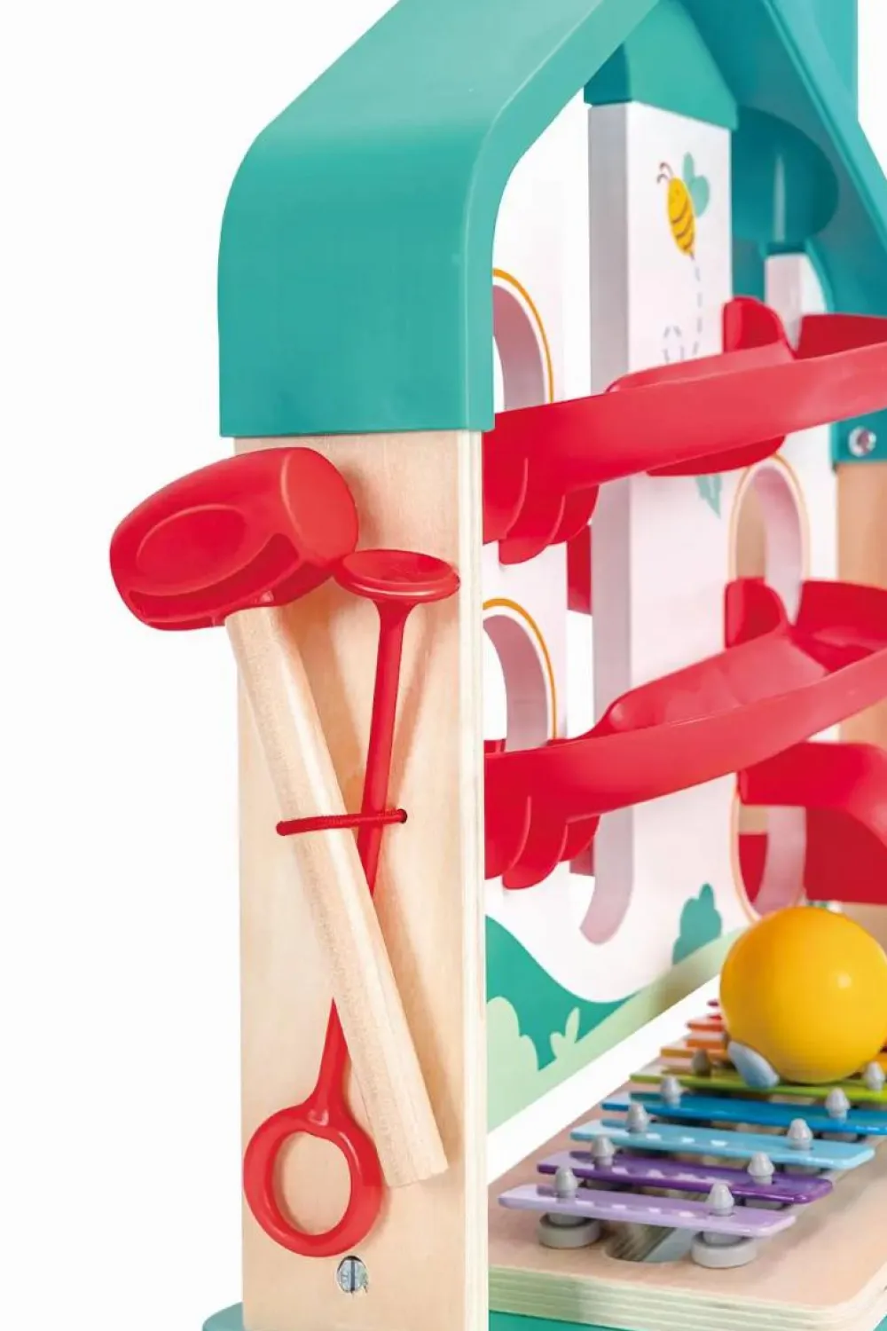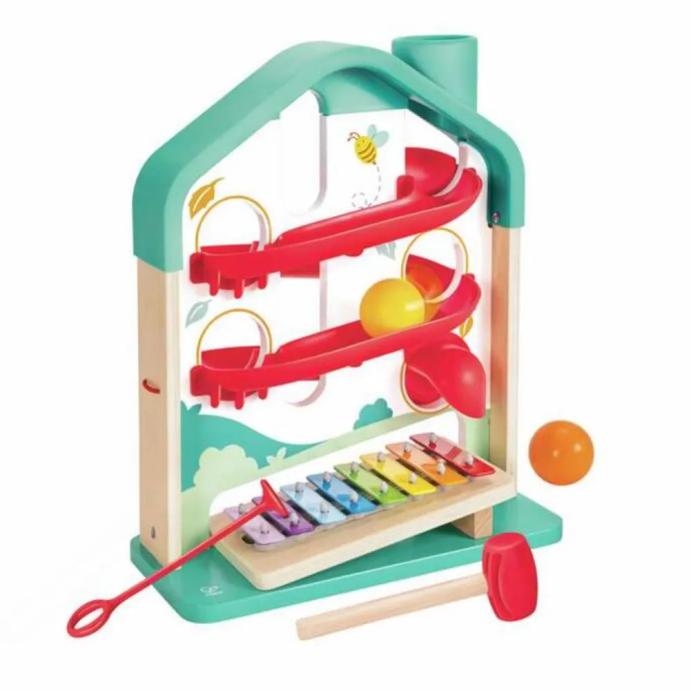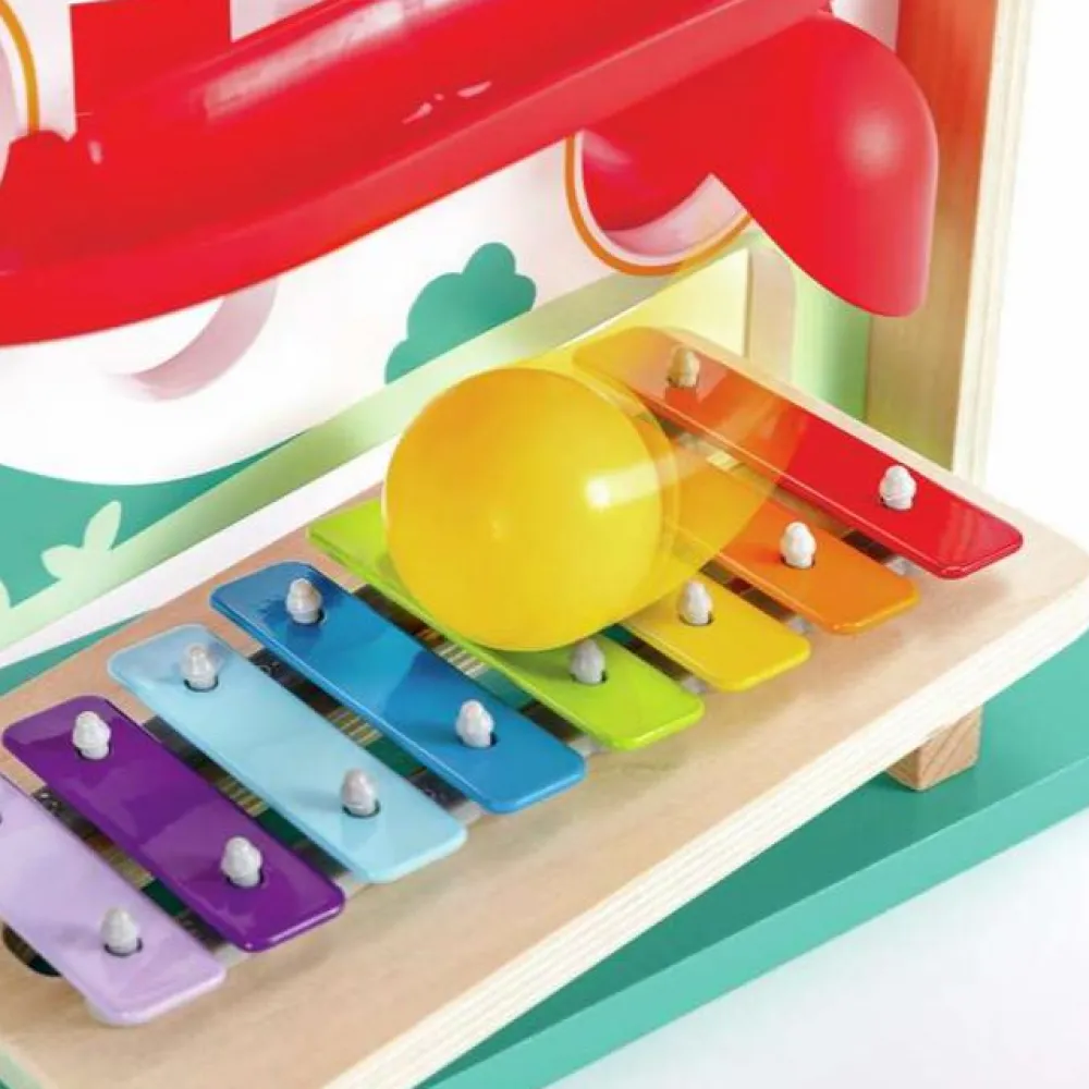 Tril kuglen afsted i banen, se den rulle afsted og lyt, når den slutter af med en musikalsk skala hen over xylofonen.