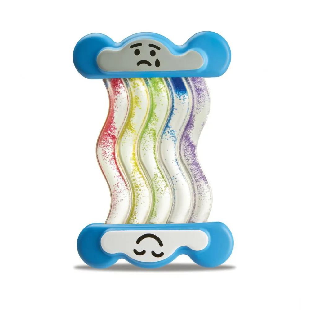 I denne følelsesfidget er der 4 rør med glimmer i, og en vred sky i den ene ende, samt en glad i den anden. Glimmeret flyder som tanker og følelser mellem de to i lukkede rør.
