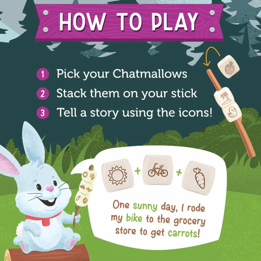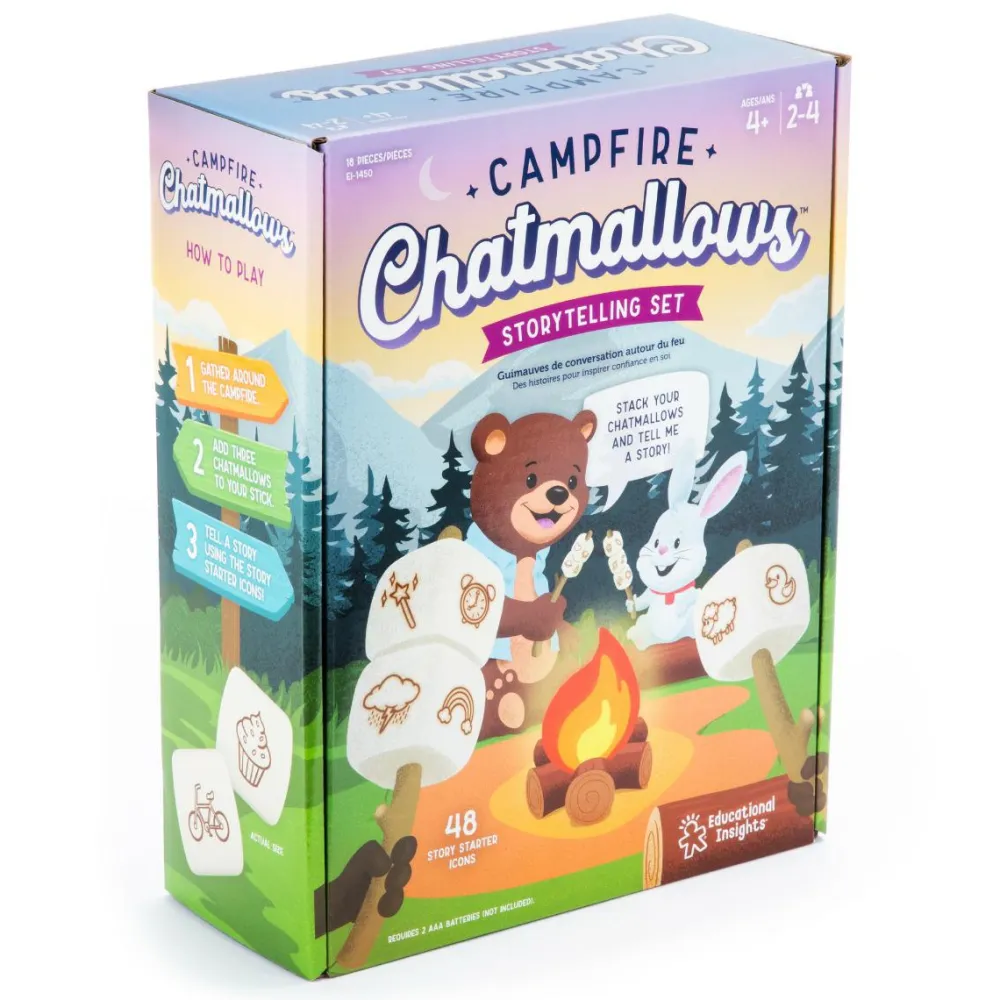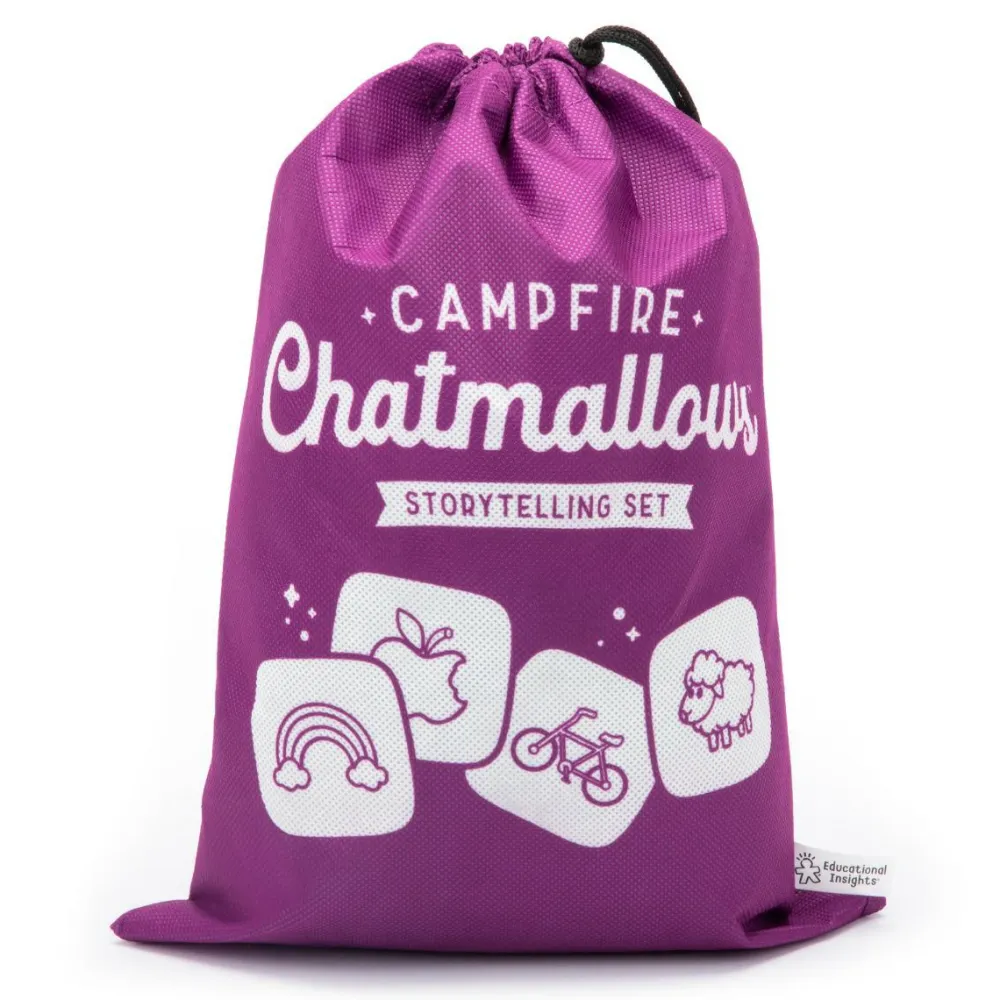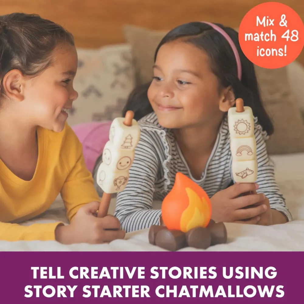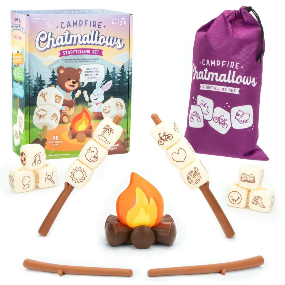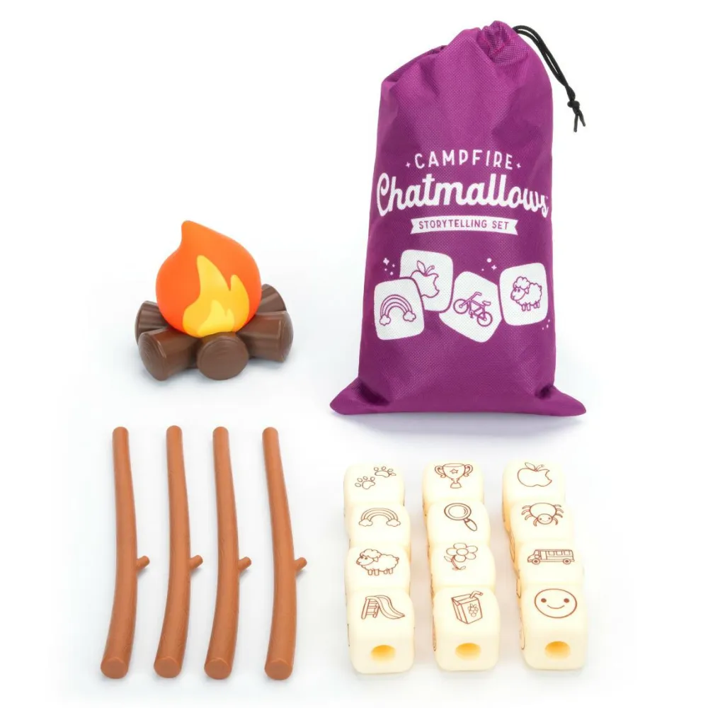 Her får I 4 skumfiduspinde, 12 skumfiduser med forskellige historieikoner på 4 sider og et lejrbål med flimrende LED-lys. Det hele kommer i en snørepose.