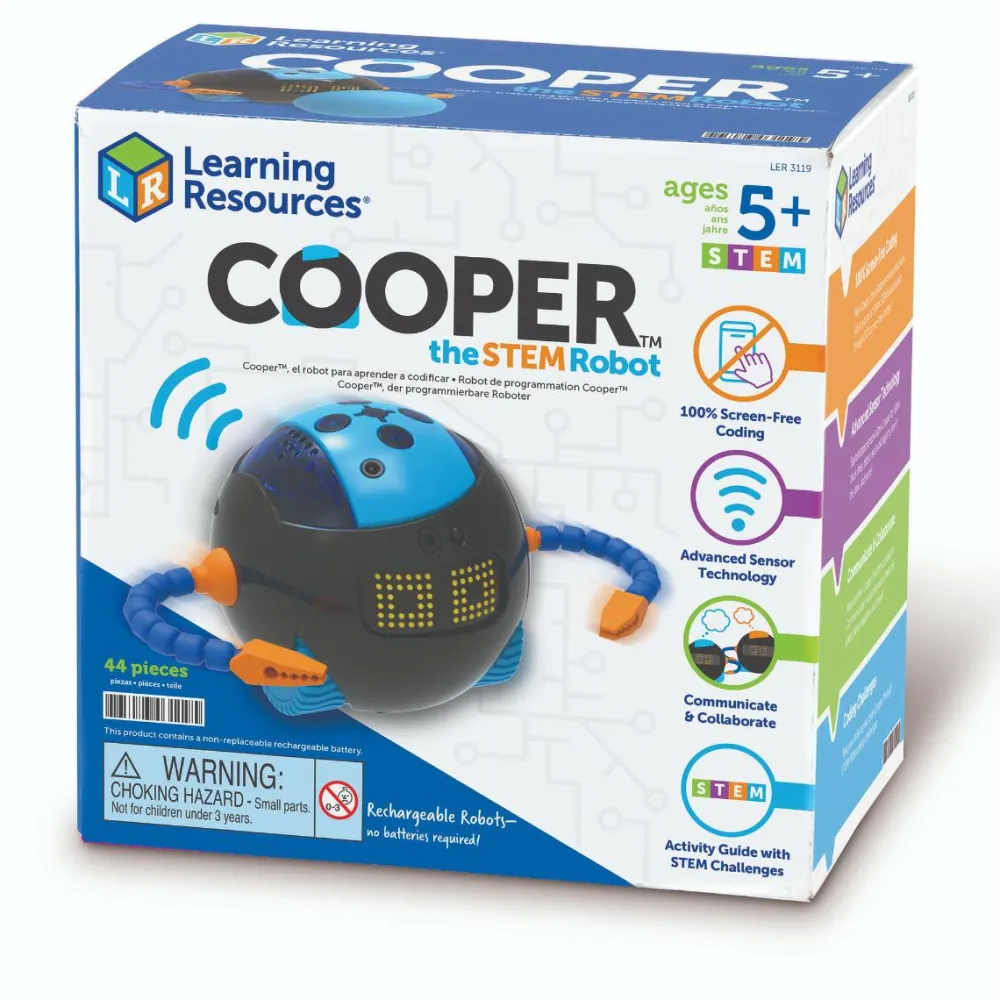 Cooper kommer med en legebold, opladerkabel (USB-C) og 40 kodekort. Desuden følger der en engelsk vejledning med, som også kommer med forslag til aktiviteter at lave med Cooper.