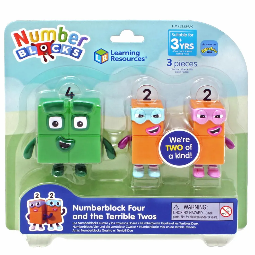 Sjove figurer fra Numberblocks universet, som viser sammenhængen mellem tallene to og fire på fysisk vis i en fantasifuld historie om gode venner med forskellige personligheder.