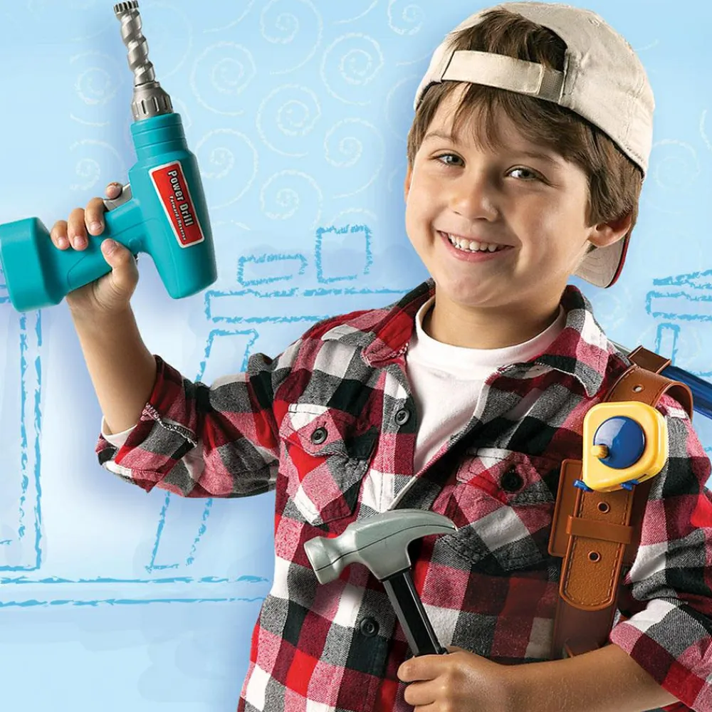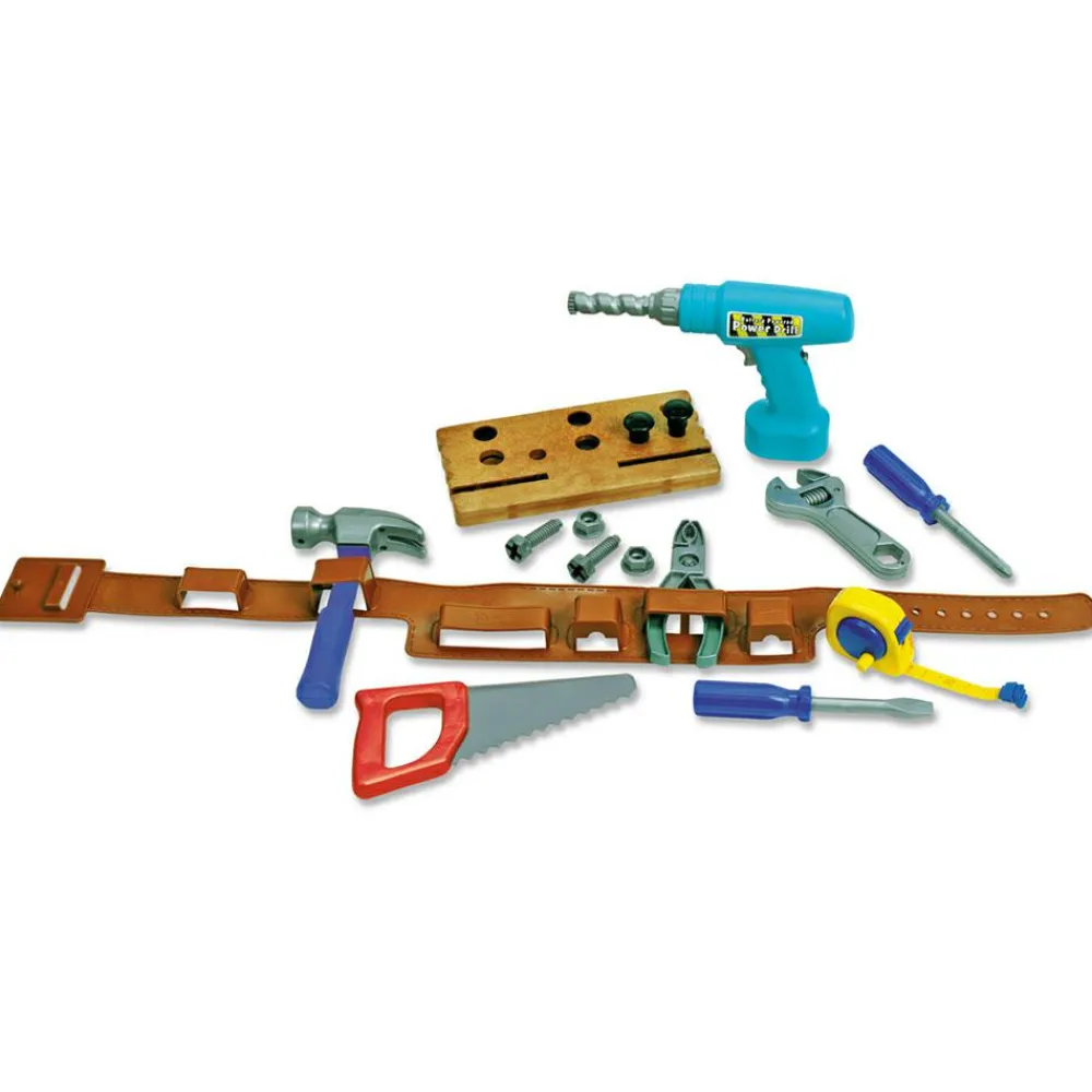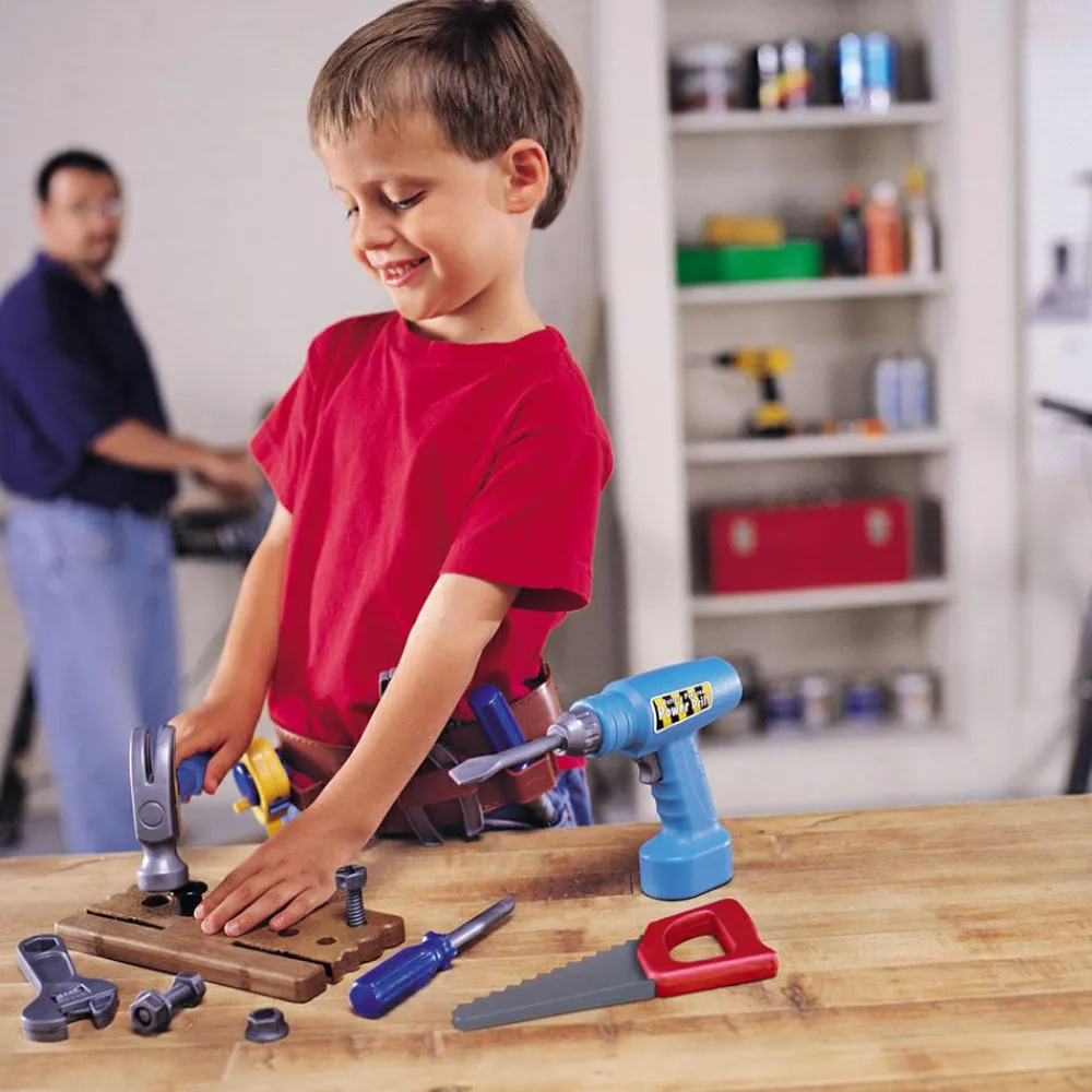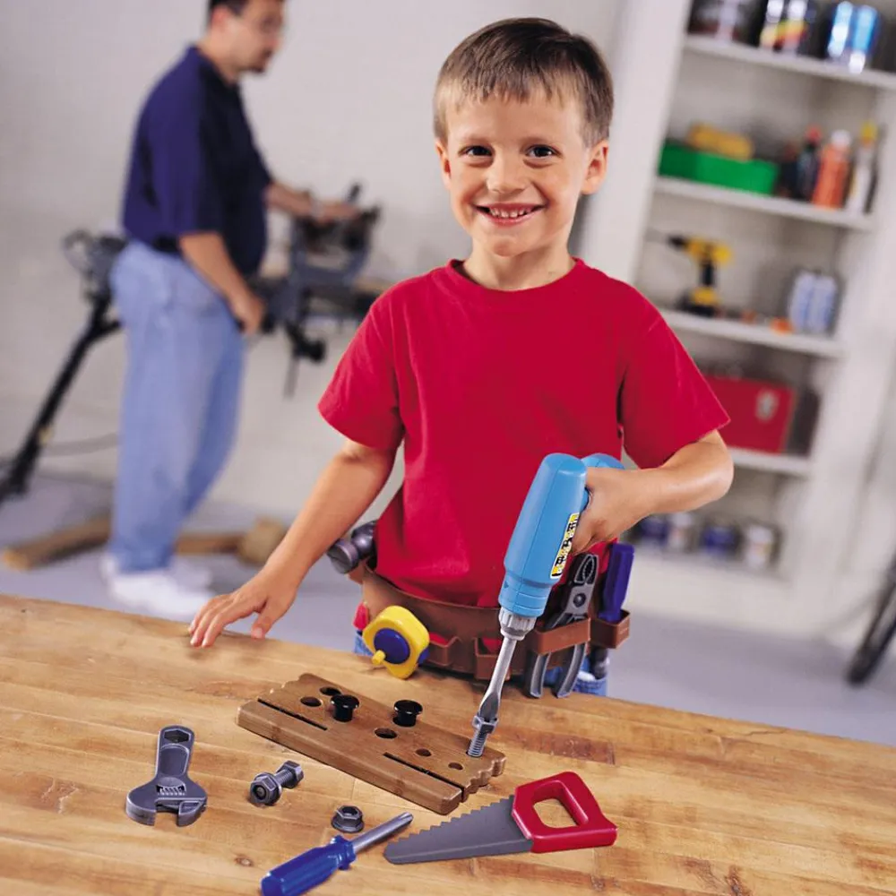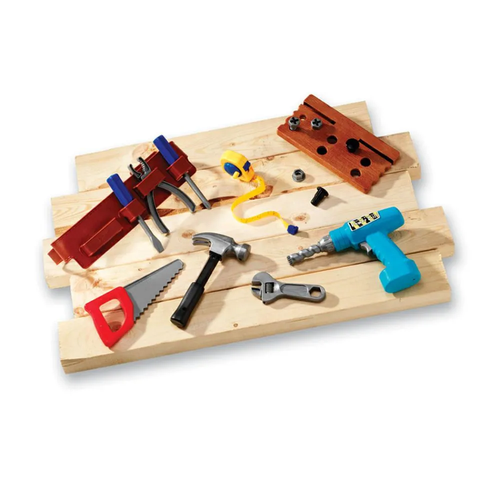 Her er alt hvad han/hun skal bruge, når der skal bores, saves, hamres, skrues og måles. Det er altid sjovt at bruge værktøj, der minder meget om fars eller mors. Størrelsen på værktøjet passer perfekt til den lille hånd. Ungerne kan få timer til at gå med at sætter bolte i træplanken og skrue dem af og på.