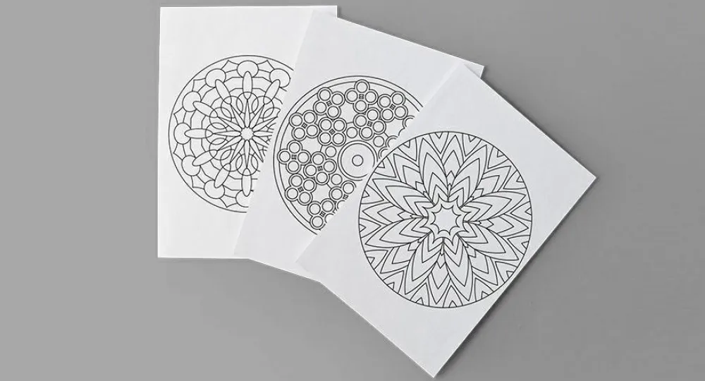 Den klassiske mandala malebog med cirkelrunde mønstre, som er stanset ud, så hver side nemt kan tages ud og bruges som ophæng eller til kort.